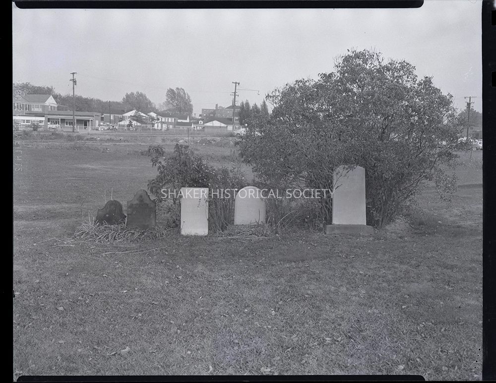 Black-and-white negative of the Stiles family cemetery plot at Warrensville West Cemetery. From left to right, the plot includes Asa Stiles, Rebecca Stiles, Wilbur Stiles, Betsey Stiles, and Calvin Fish. The gravestones are surrounded by shrubs and grasses. Van Aken Boulevard is visible in the background.Photograph Details