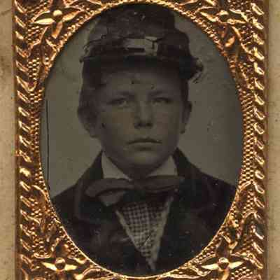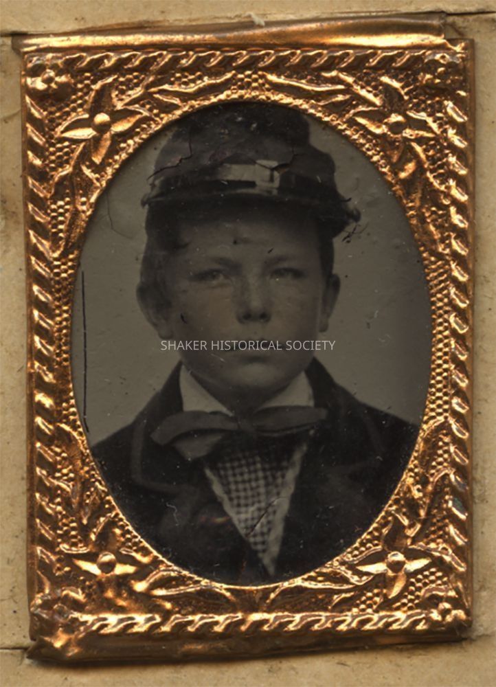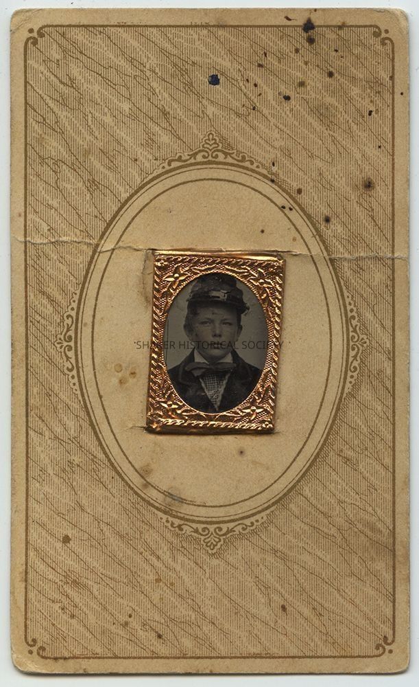 Tintype gem portrait of a young boy identified as Sylvanus Corlett, brother of Clara Corlett Murfett, on verso. Tintype features some hand tinting on the subject's face and is mounted in an elaborate miniature frame to a decorative cartes-de-visite size card.Photograph Details