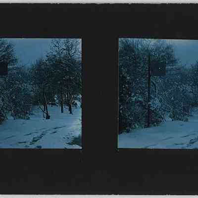 Blue-toned black-and-white stereograph photographs by Ladis Lisy of the Bird Sanctuary sign at Lower Lake. Photographs are mounted on black board with handwritten notes about the date, location, exposure, and developer on verso.Photograph Details