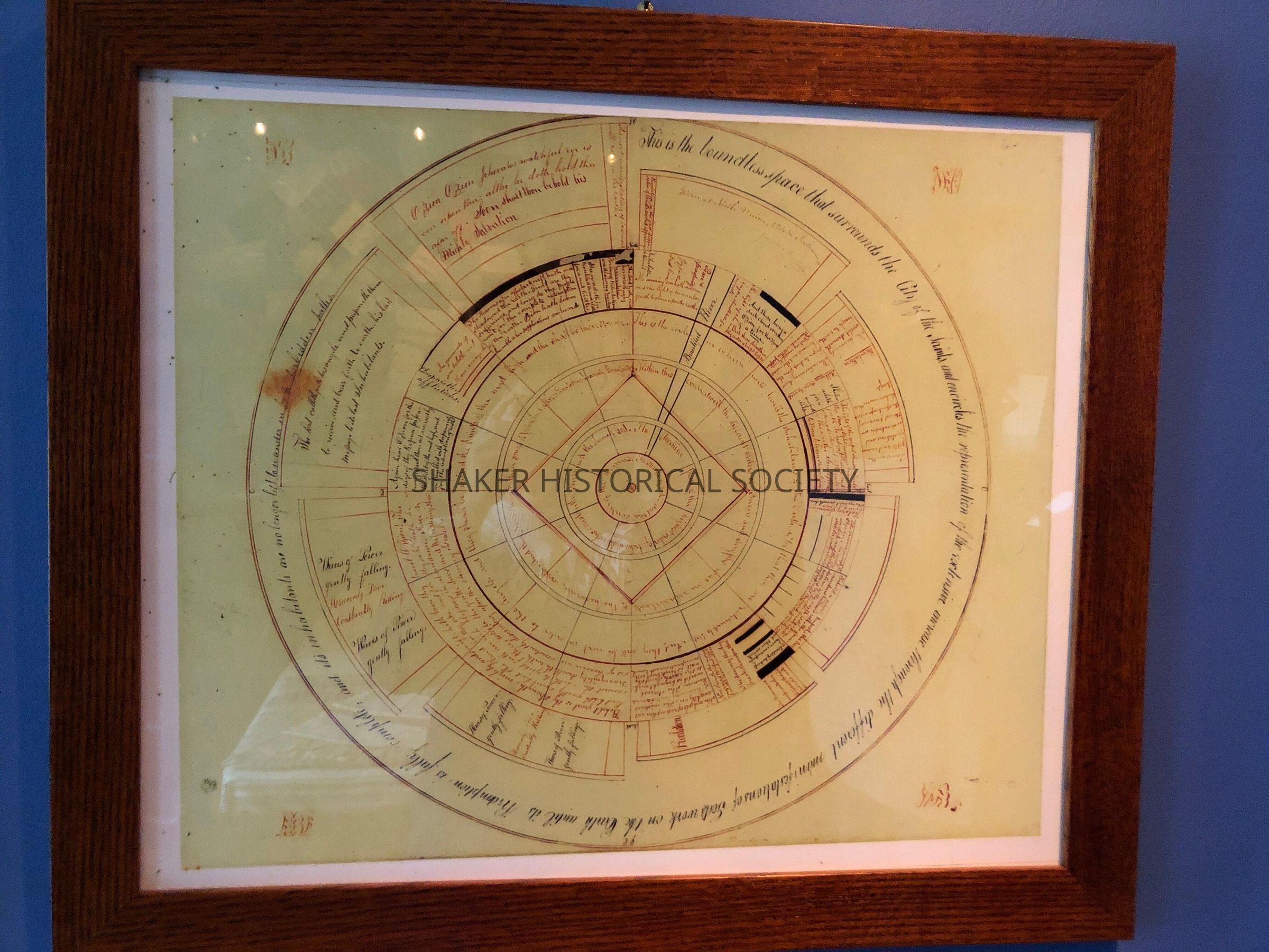 Reproduction print of a Shaker spirit drawing by North Union Shaker James Mott. This is the only known spirit drawing/gift drawing from the North Union community. By signing his name "Instrument James M. Mott," the draftsman identified himself as the recipient of a spiritual gift that he translated into visible form. Using concentric circles and radiating lines, Mott mapped a cosmos centered on "The Throne of God, and the center of the Heavens." He wrote the names of the cardinal directions on the perimeter of the second outermost circle, a shape that defines one limit of "The boundless space that surround the City of the Saints."