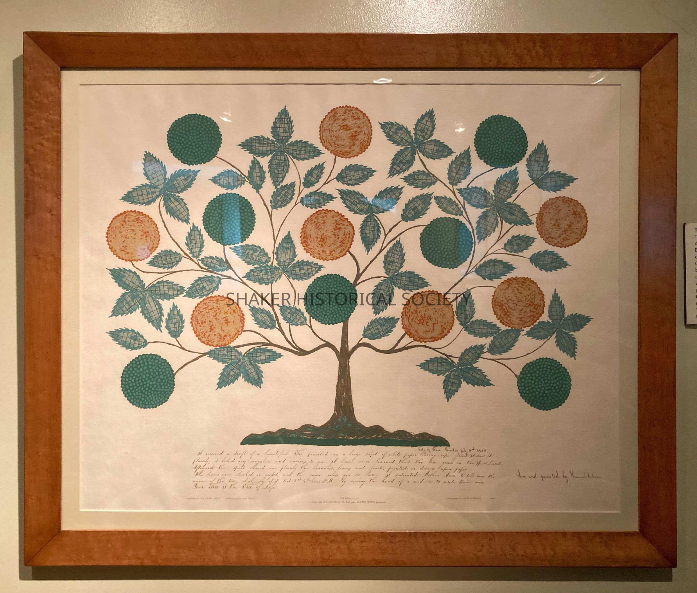 Silkscreen reproduction of Hannah Cohoon's "Tree of Life" by Allen Saalburg's Canal Press in Frenchtown, New Jersey, 1949. The original painting was completed in 1854 in Hancock Shaker Village in Massachusetts.
