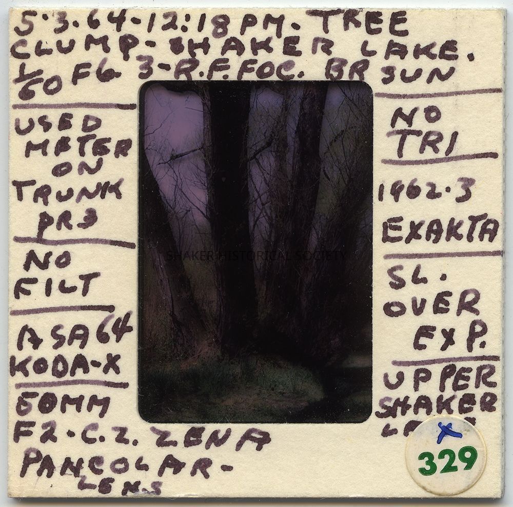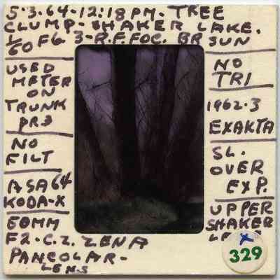 Color slide (Kodachrome II) by Ladis Lisy of a "tree clump" at Lower Lake. Slide mount is annotated with photographic technical information.Photograph Details