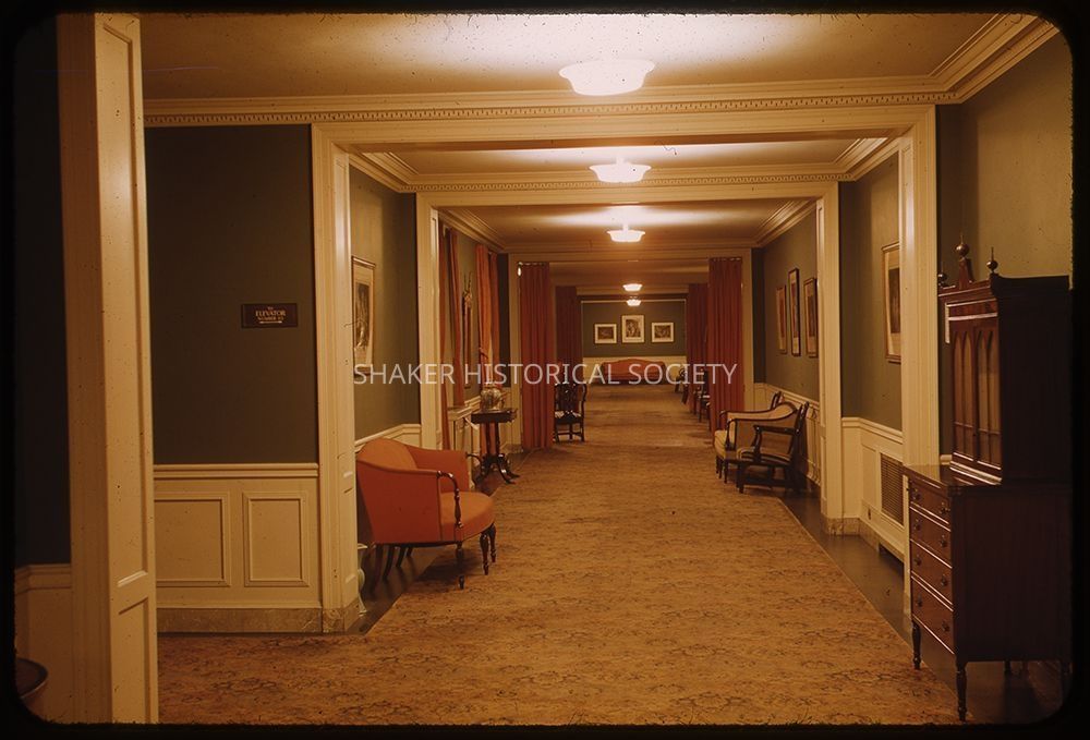 Color slide (Kodachrome) of the hallway with carpeted floors of an unidentified building at Shaker Square. Chairs and photographs line the hall.Photograph Details