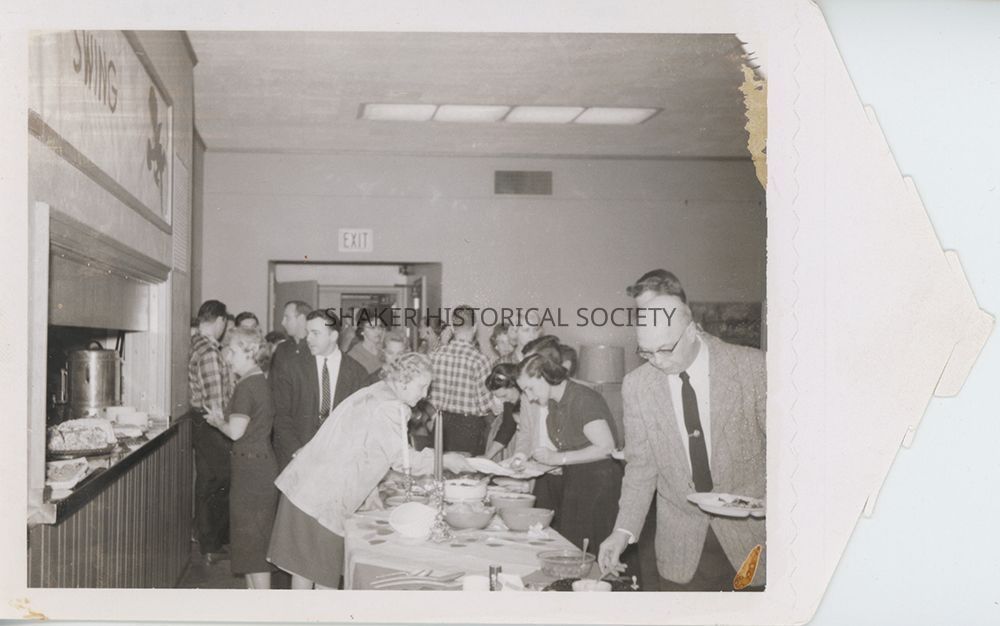 Black-and-white polaroid of a group of people at a potluck, likely a Shaker Players cast and crew dinner for "Come Back, Little Sheba."Photograph Details
