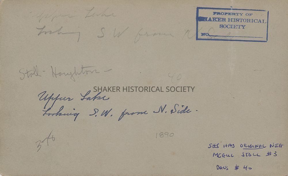 Black-and-white photograph from 1890 of Upper Lake (Horseshoe Lake) looking southwest from the north side. Title taken from caption on verso. Handwritten note on verso: "SHS has original neg. McGill Stoll #3, Baus #40"Photograph Details