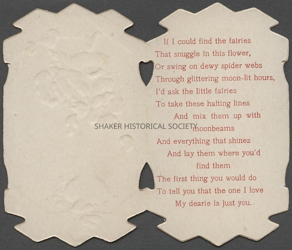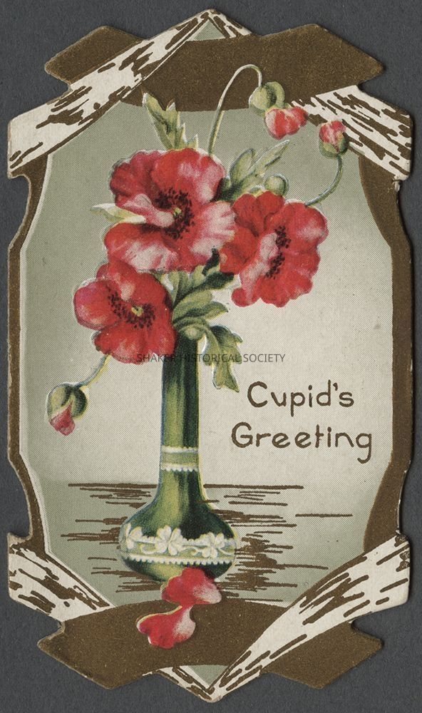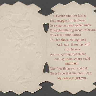 Valentine card published by an unknown publisher featuring an illustration red/pink poppies in a green vase with "Cupid's Greeting" to the left of the vase. The inside of the card features a Valentine's Day poem: "If I could find the fairies / That snuggle in this flower, / Or Swing on dewy spider webs / Through glittering moon-lit hours, / I'd ask the little fairies / To take these halting lines / And mis them up with moonbeams / And everything that shines / And lay them where you'd find them / The first thing you would do / To tell you that the one I love / My dearie is just you."Category