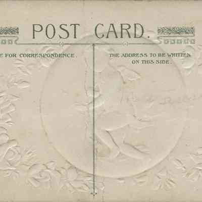 Embossed Valentine postcard printed in Germany and published by an unknown publisher. The front features an illustration with glitter accents of red and pink roses surrounding a cherub holding a bow and arrow. The phrase “Valentine Greeting” is printed in the upper right corner.Category