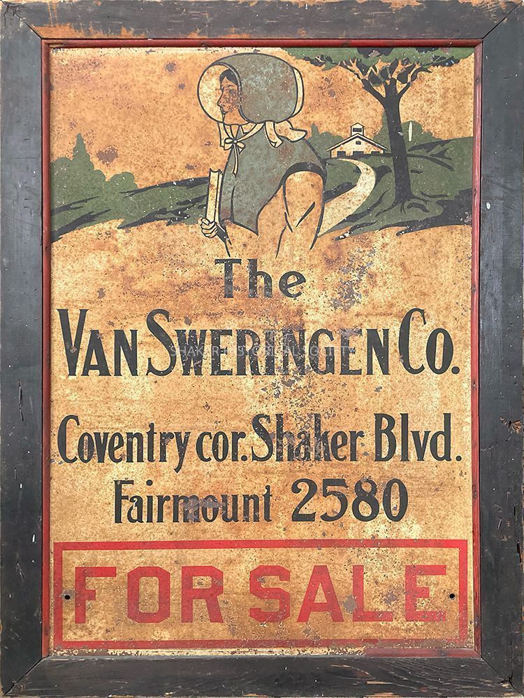 The Van Sweringen Co. "For Sale" sign painted on tin and framed in wood. The top of the sign features a Shaker woman in a blue bonnet with a pastoral scene in the background. Text below the woman reads: "The Van Sweringen Co. / Coventry cor. Shaker Blvd. / Fairmount 2580 / FOR SALE"Other Names and Numbers