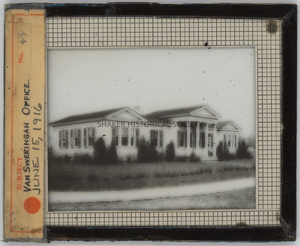 Glass lantern slide featuring a black-and-white photograph of the Van Sweringen sales office originally at Coventry and Shaker Boulevard, later moved to Shaker and Warrensville Center. Label taped along left side reads "Van Sweringan [sic] Office June 15, 1916." Black tape around edges is flaking.Photograph Details