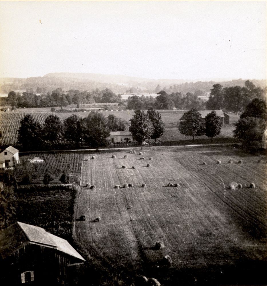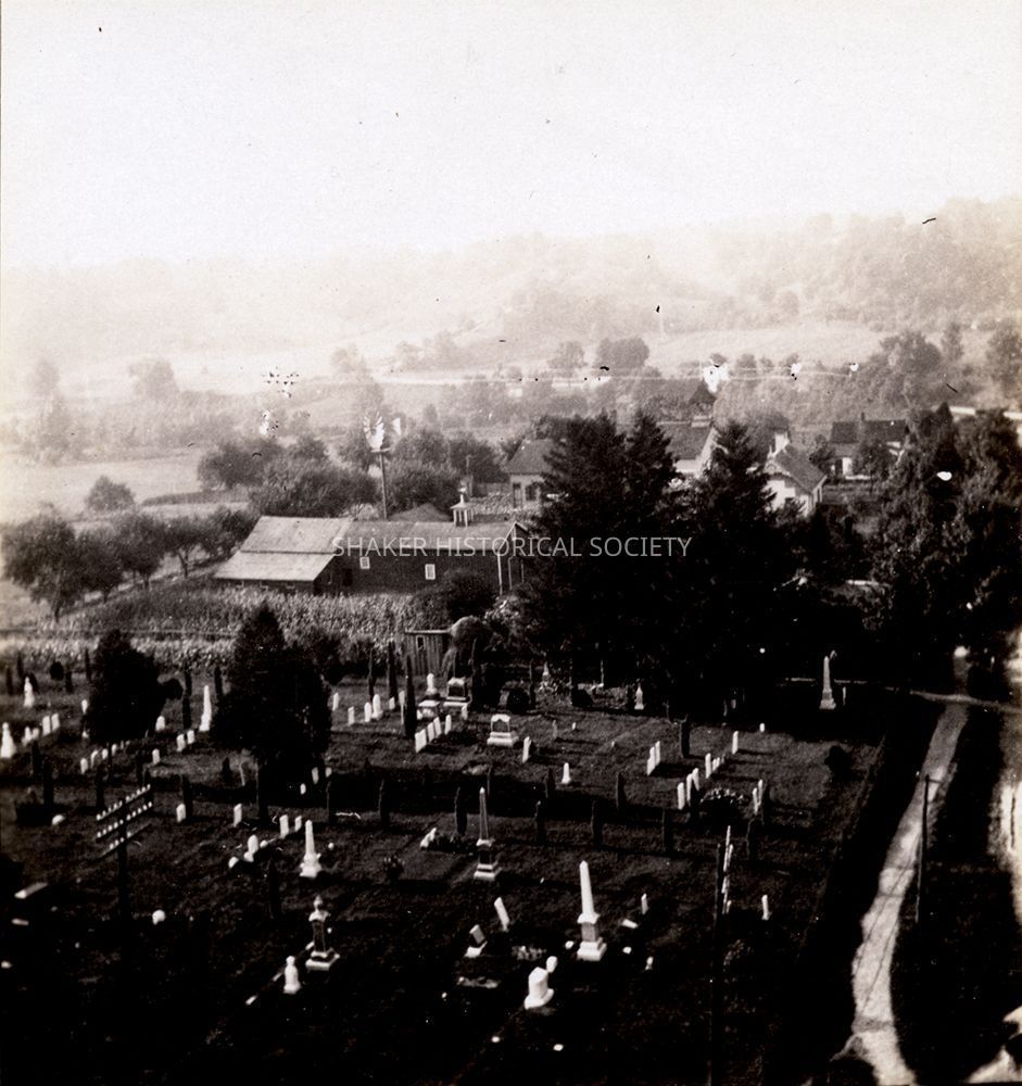Plate M from from Shakers & Kirtland by Louis Baus showing four views from the tower of the Mormon Kirtland Temple in Kirtland, Ohio. View #1 is a southwest view showing many buildings and farmland. View #2 is a southwest view showing a field with bales of hay. View #3 is a west view showing several buildings among trees. View #4 is a north view showing the historic Kirtland North Cemetery in the foreground and many buildings and trees in the background.
