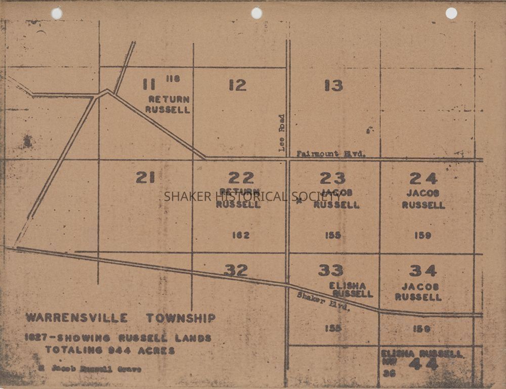 Reproduction 1827 map from an unknown source showing Russell lands in Warrensville Township totaling 944 acres. Lots 11 and 22 are identified as belonging to Return Russell; Lots 23, 24, and 34 as belonging to Jacob Russell; and lot 33 and part of lot 44 as belonging to Elisha Russell.