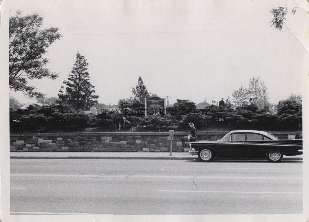 Black-and-white photograph of Warrensville West Cemetery from Lee Road. The cemetery marker, dedicated in 1959, is visible in the center of the photograph.Photograph Details