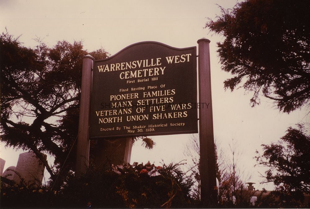 Color photograph of the marker installed by Shaker Historical Society in 1959 at Warrensville West Cemetery along Lee Road. Color shift evident; image exhibits yellow-magenta cast consistent with cyan dye fading.Photograph Details