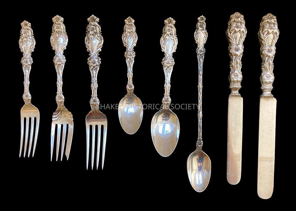 Whiting Lily flatware estimated to have been made between 1902-1916. Place setting includes two knives, three forks, and three spoons.
