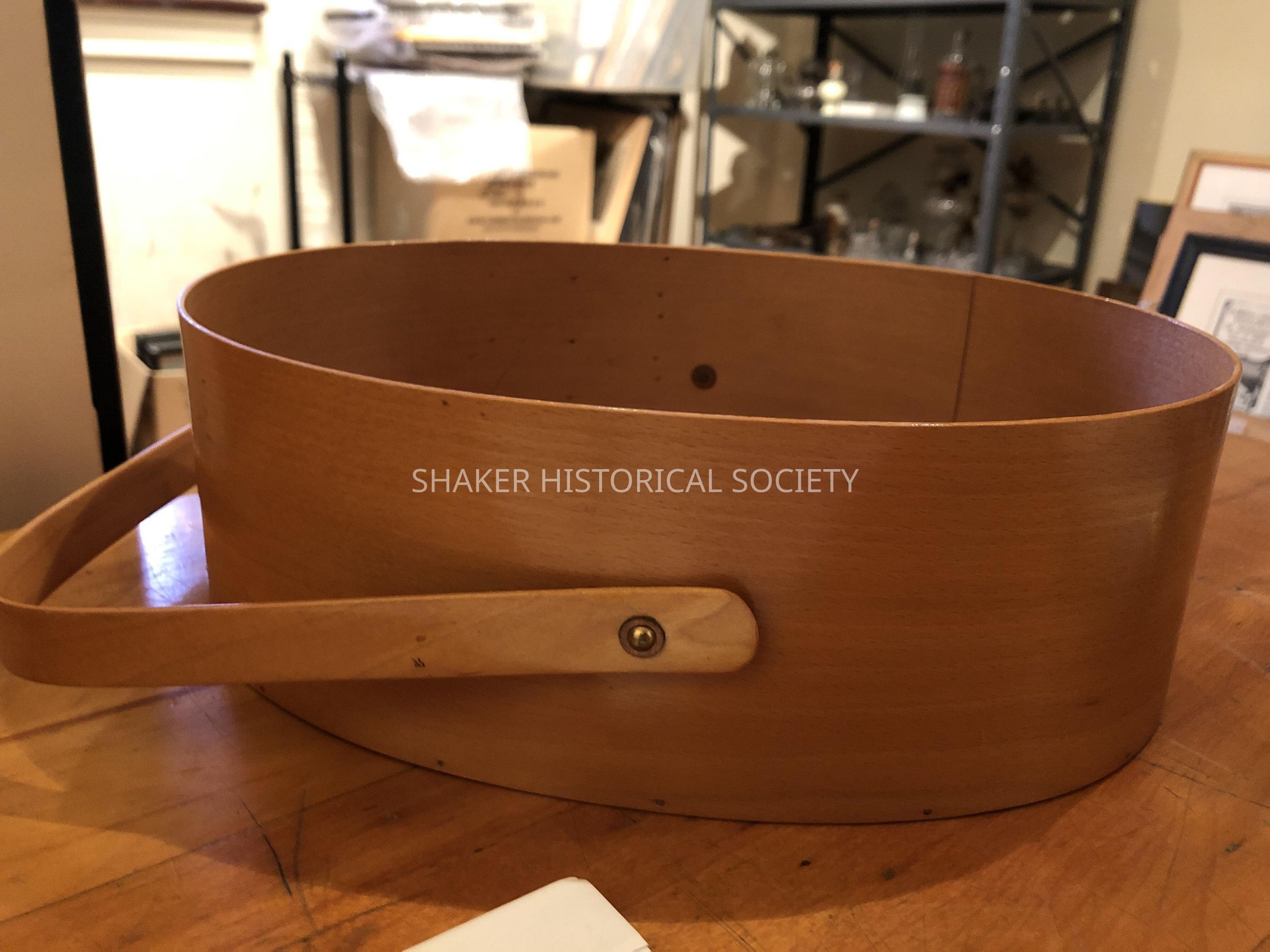 Four-fingered carrier box with handle, marked Sabbathday Lake on bottomCollection