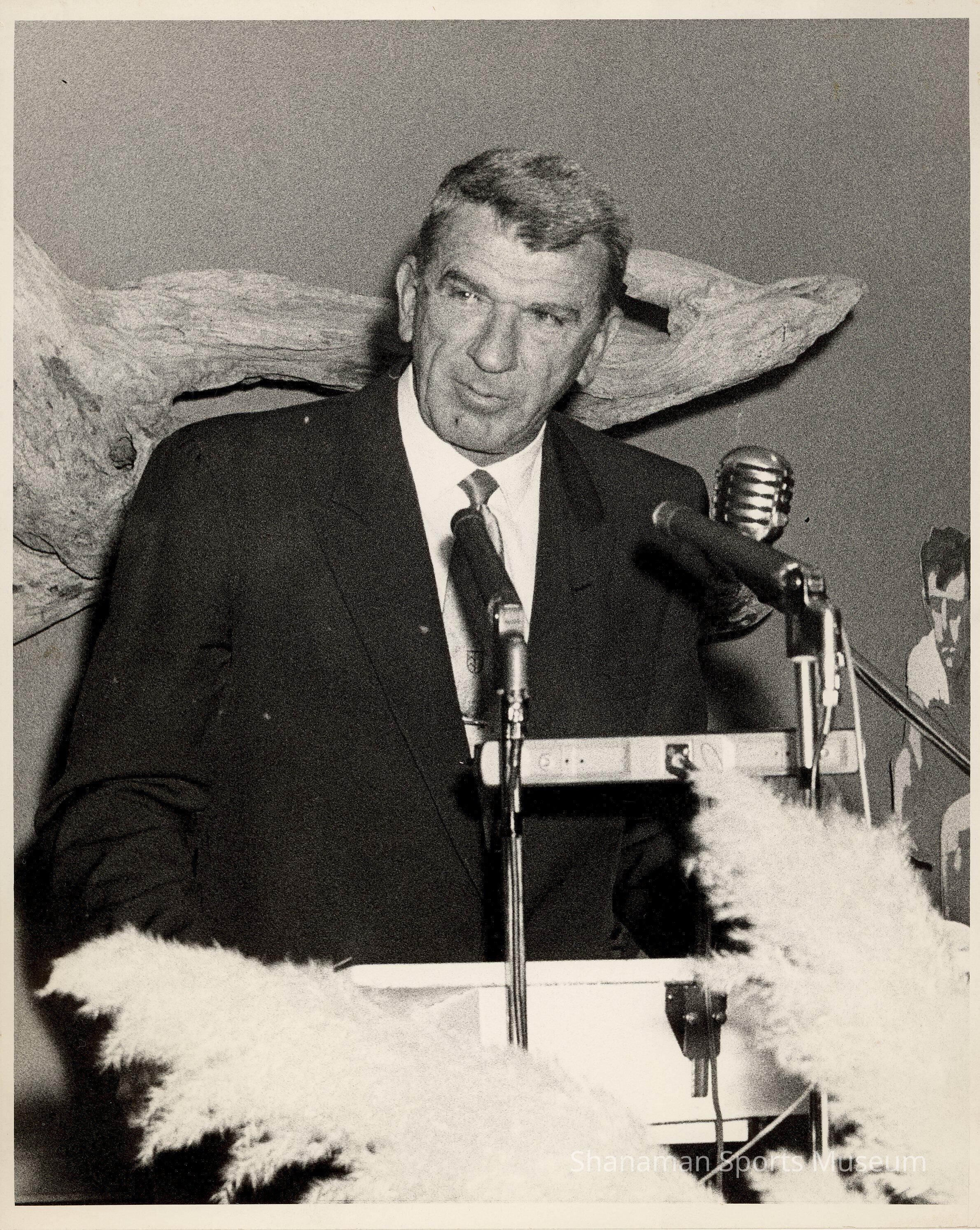 A black and white photograph of Carl Hubbell who served as the San Francisco Giants farm director. In the photo, Hubbell is speaking at press conference in Tacoma about the new Tacoma Giants minor franchise where the two teams and cities partnered with each other six years (1960-1965). The Tacoma Giants were the first team to play at Cheney Stadium.Lexicon