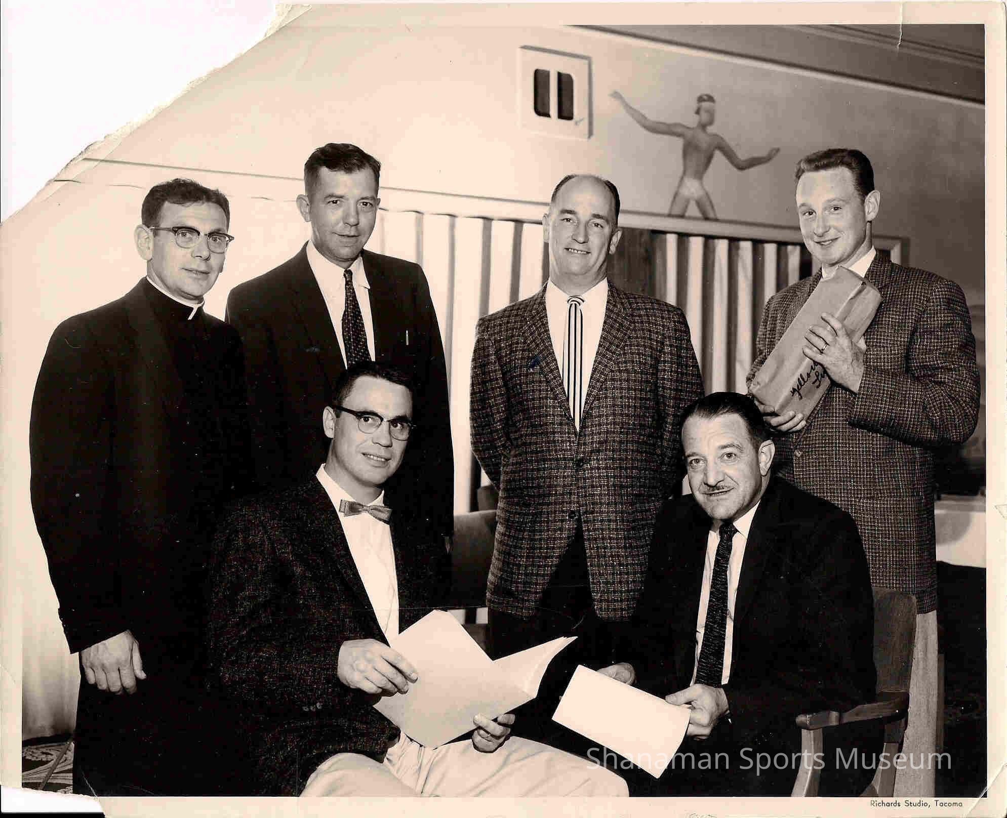 mong the six men in this black-and-white photo stands Bob Robertson, the longtime radio sports announcer. Robertson, standing in the back row on the right, announced the Tacoma Rainiers for many years beginning in 1960. Standing next to Robertson is Norm Mayer, who coached the Lincoln High School's football team for 23 years and compiled a 140-50-6 record. In 1948, Mayer led the Abes football team to a state title. In the photo, the two men sitting in the front holding papers are (left to right) Gerry Austin and Dill Howell. Standing in back (l-r) is the Bellarmine Athletic Director (name unknown, wearing priest's collar), Bob Levinson, Mayer, and Robertson.Lexicon
