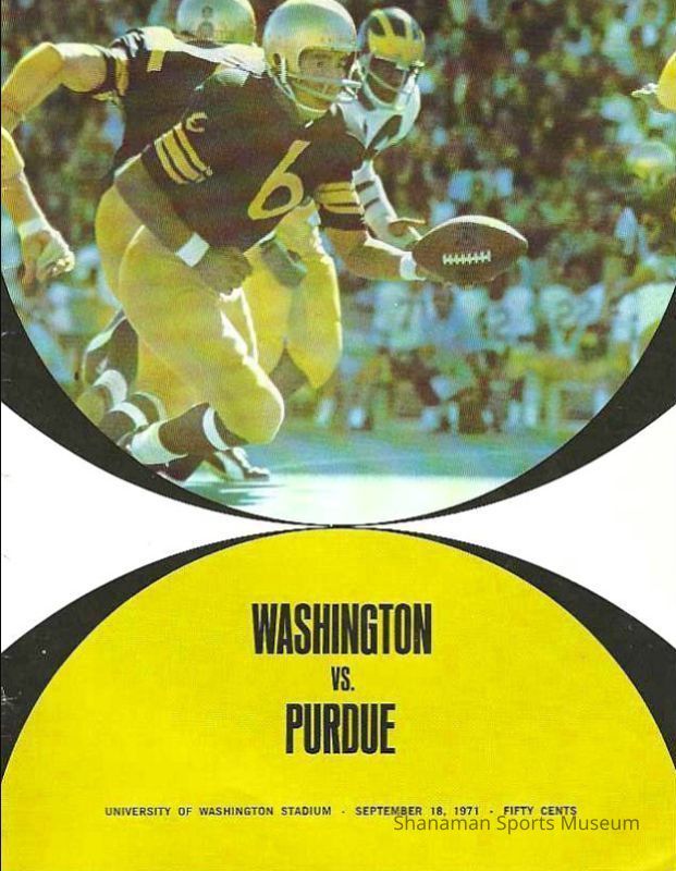 A football program from the University of Washington (UW) vs Purdue University, September 18, 1971. At the University of Washington Stadium. From the Husky Sideliner (official UW football magazine).Lexicon