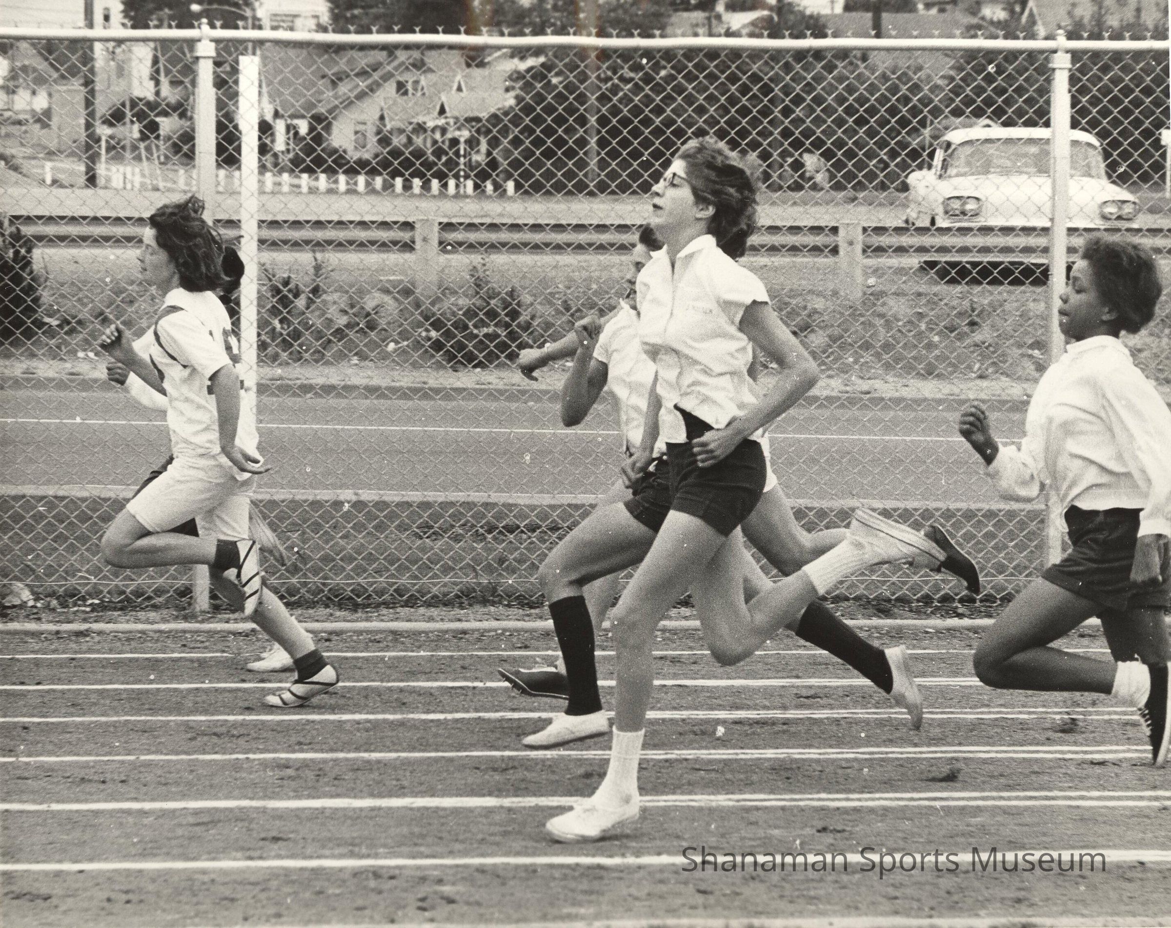Photo, b/w, 6 young women running on track, in various gym clothes. Typed on reverse: "June 8, 1968 Women's Track Meet at UPS". Women unidentified.Lexicon