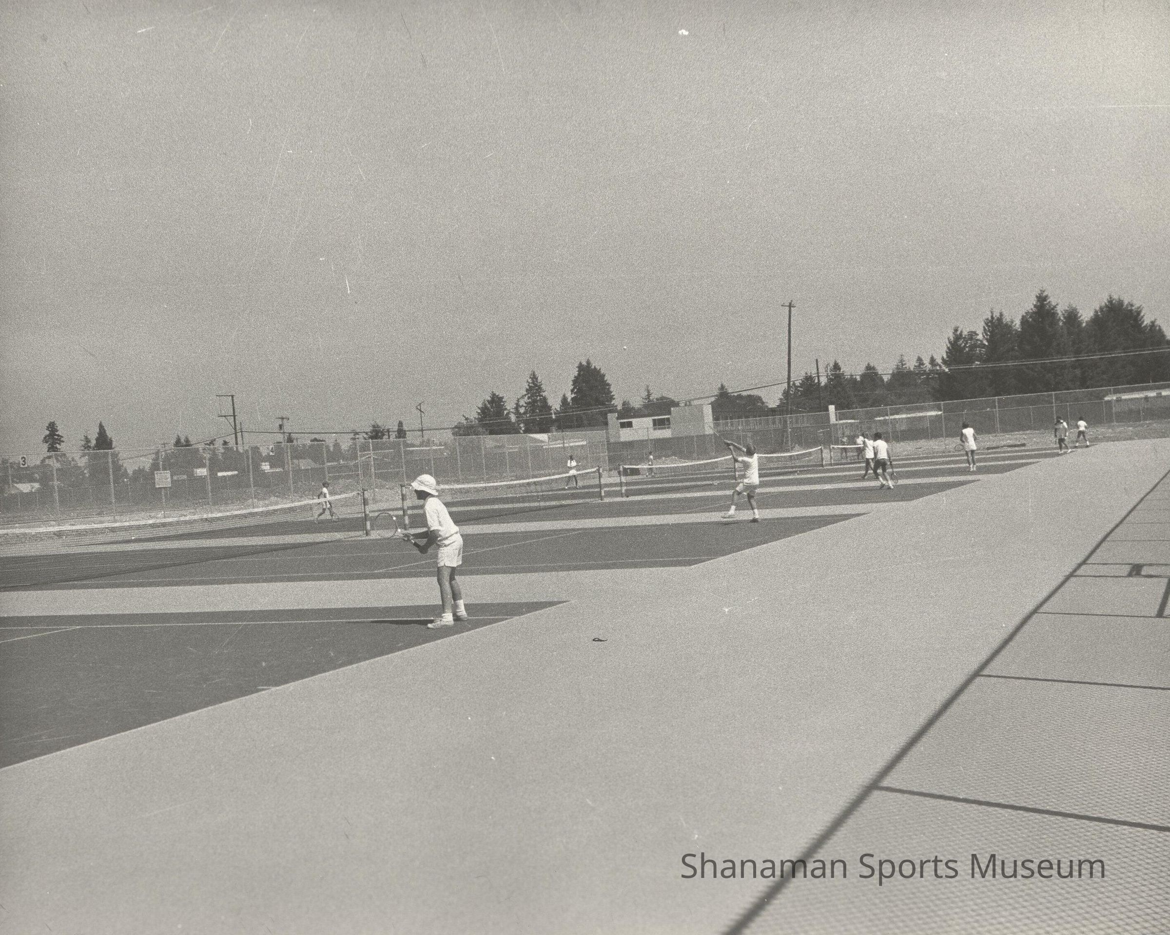 On a warm and sunny day, some people play tennis in a 1970 tournament on six courts at the Public Courts Tournament in Tacoma.Lexicon