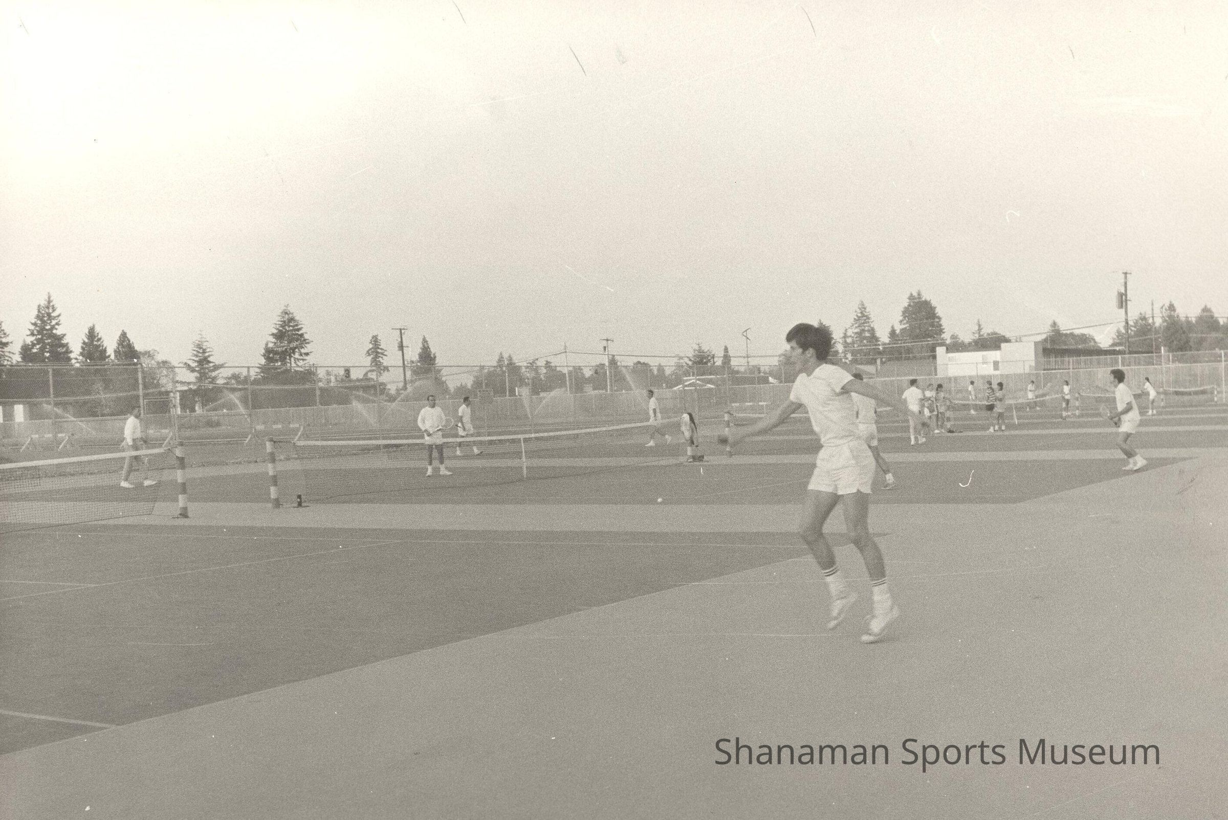 These tennis courts are full of action as players participate in the Public Courts Tennis Tournament in 1970. Written on reverse: "1970 Public Courts Tennis Toury".Lexicon