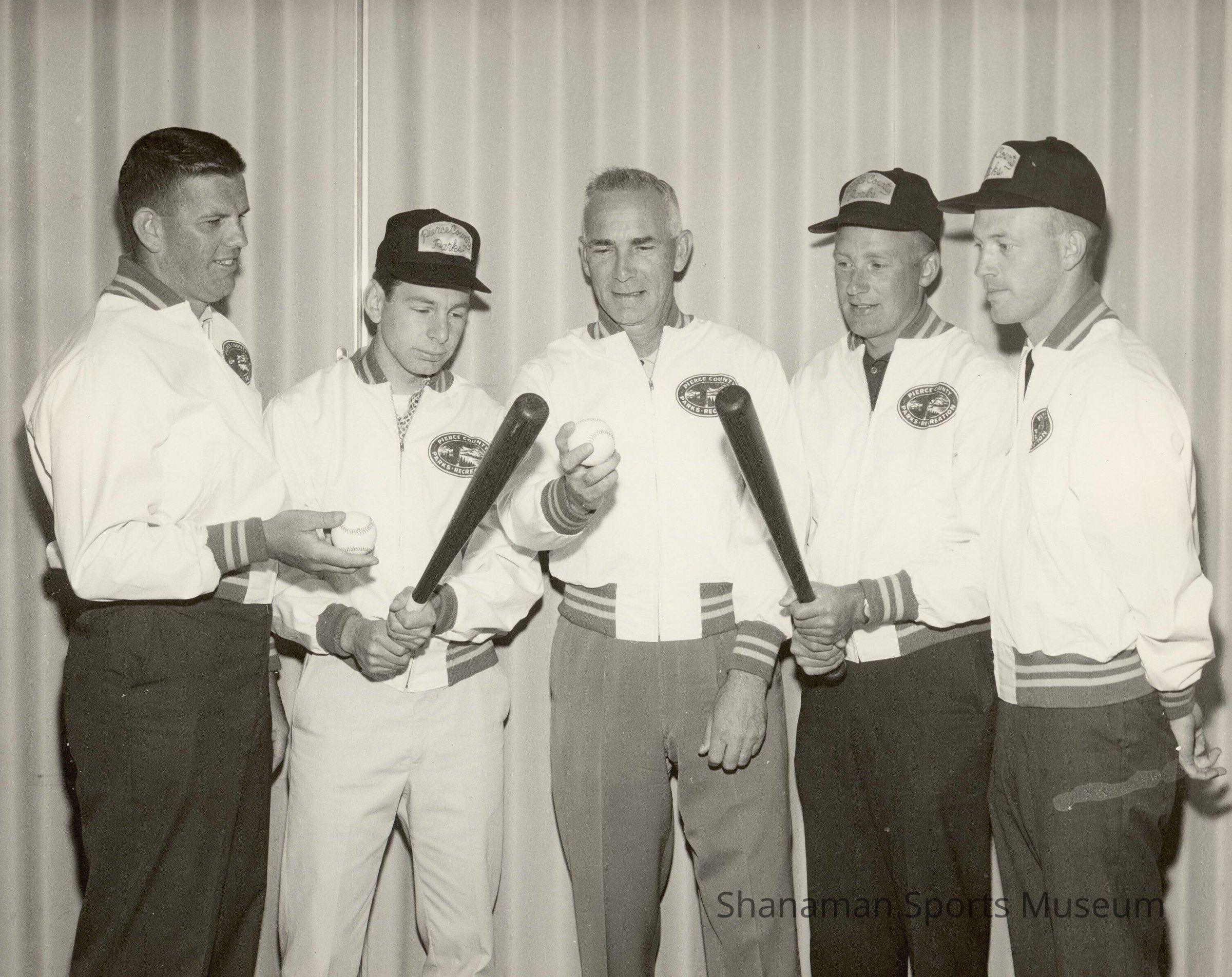 Members of the Pierce County Parks Department Baseball pose together for the Pierce County Parks Baseball School in 1965. Members Jack Johnson, Marv Scott, George Grant are with Chris Cherbas and Merle Hagbo who holding baseball bats in the picture. The men are all legends in promoting not only baseball but sports in the Puget Sound area.
