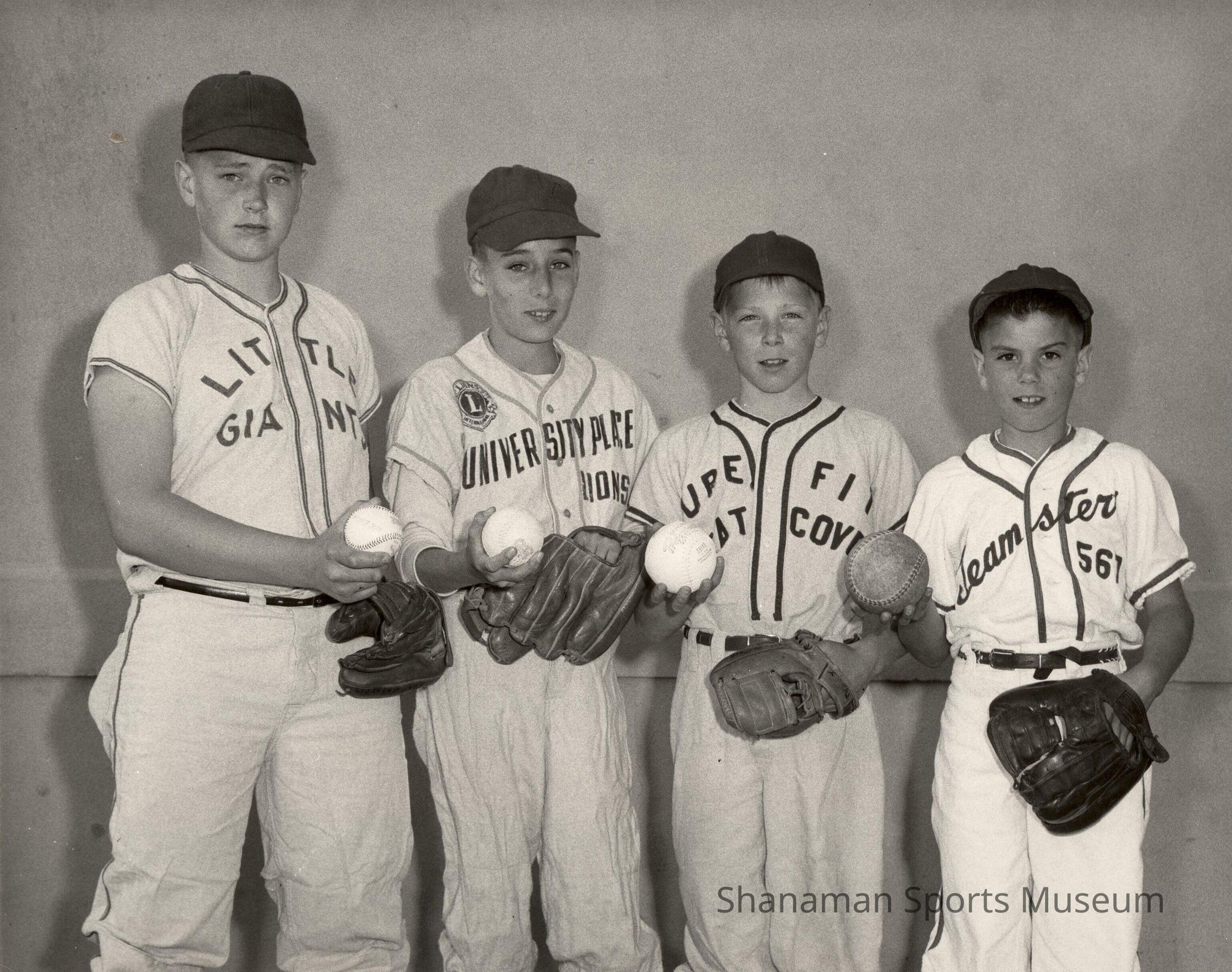 A black and white photograph of players wearing their youth baseball uniforms with the Little Giants, University Place Lions, Teamsters and an unknown team. Youth baseball has had a major impact on sports in the Northwest and the Pierce County area providing kids from the area a competitive environment. Many players who participated in these leagues went on to become some of the more influential athletes, coaches and officials to come out of the Northwest.Lexicon