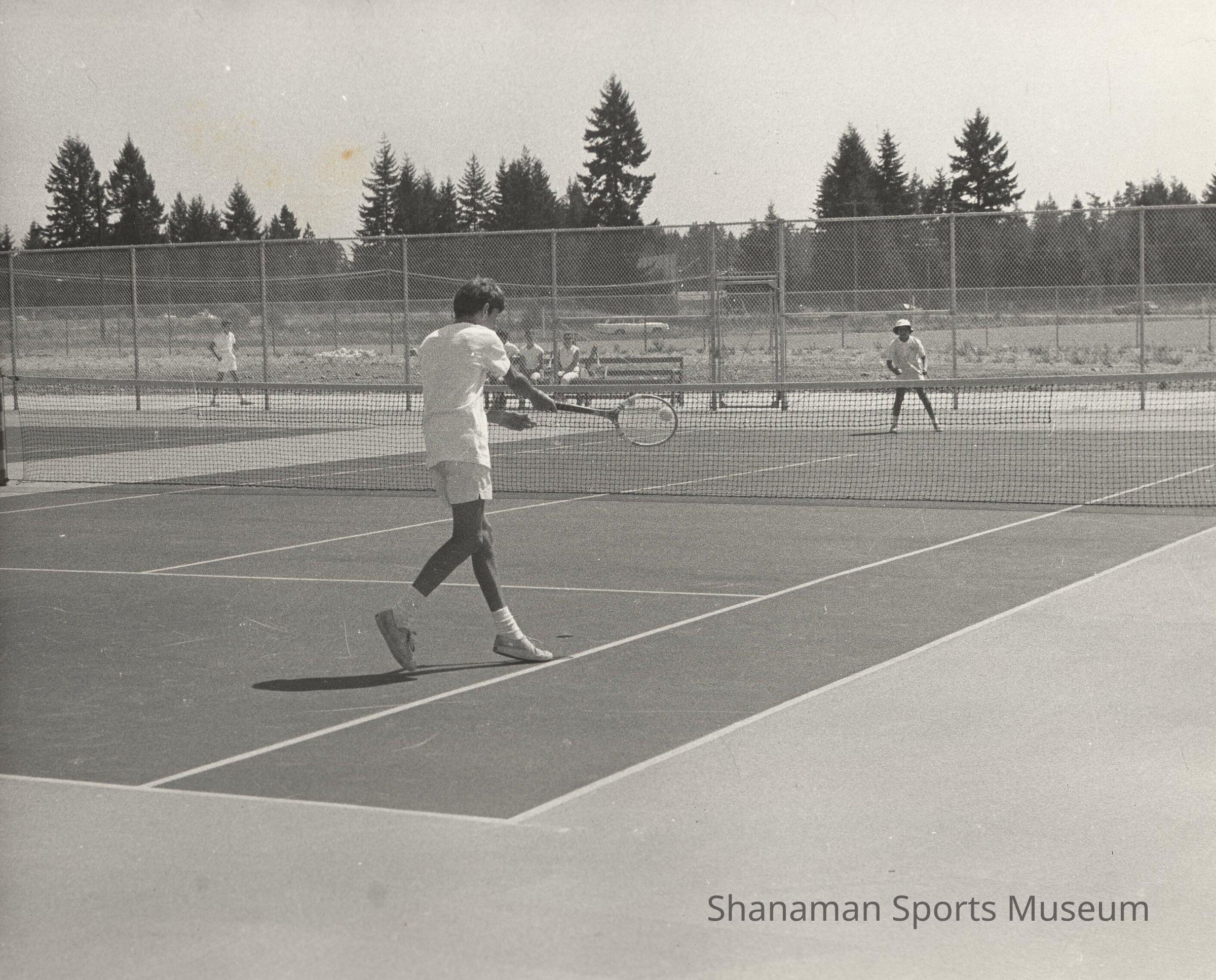 Hoping for a winning shot, a tennis player drills a forehand shot down the line during the 1970 Public Courts Tournament.Lexicon