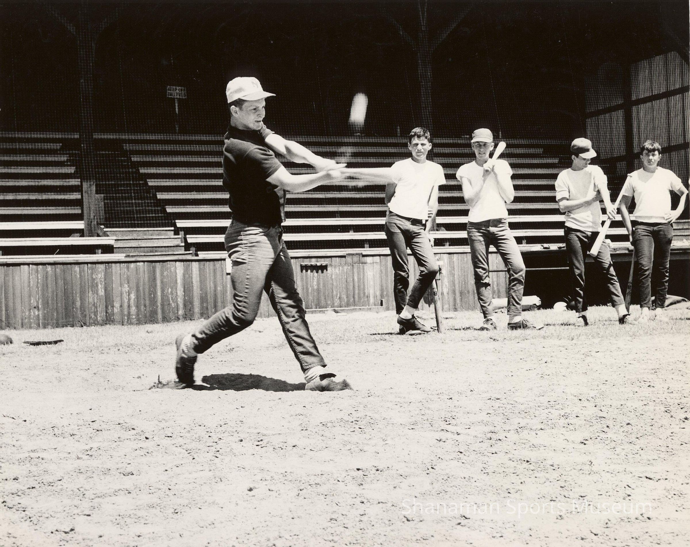 A batter hits a fly ball as four players await their turn at an undated photo of baseball practice, location unknown.