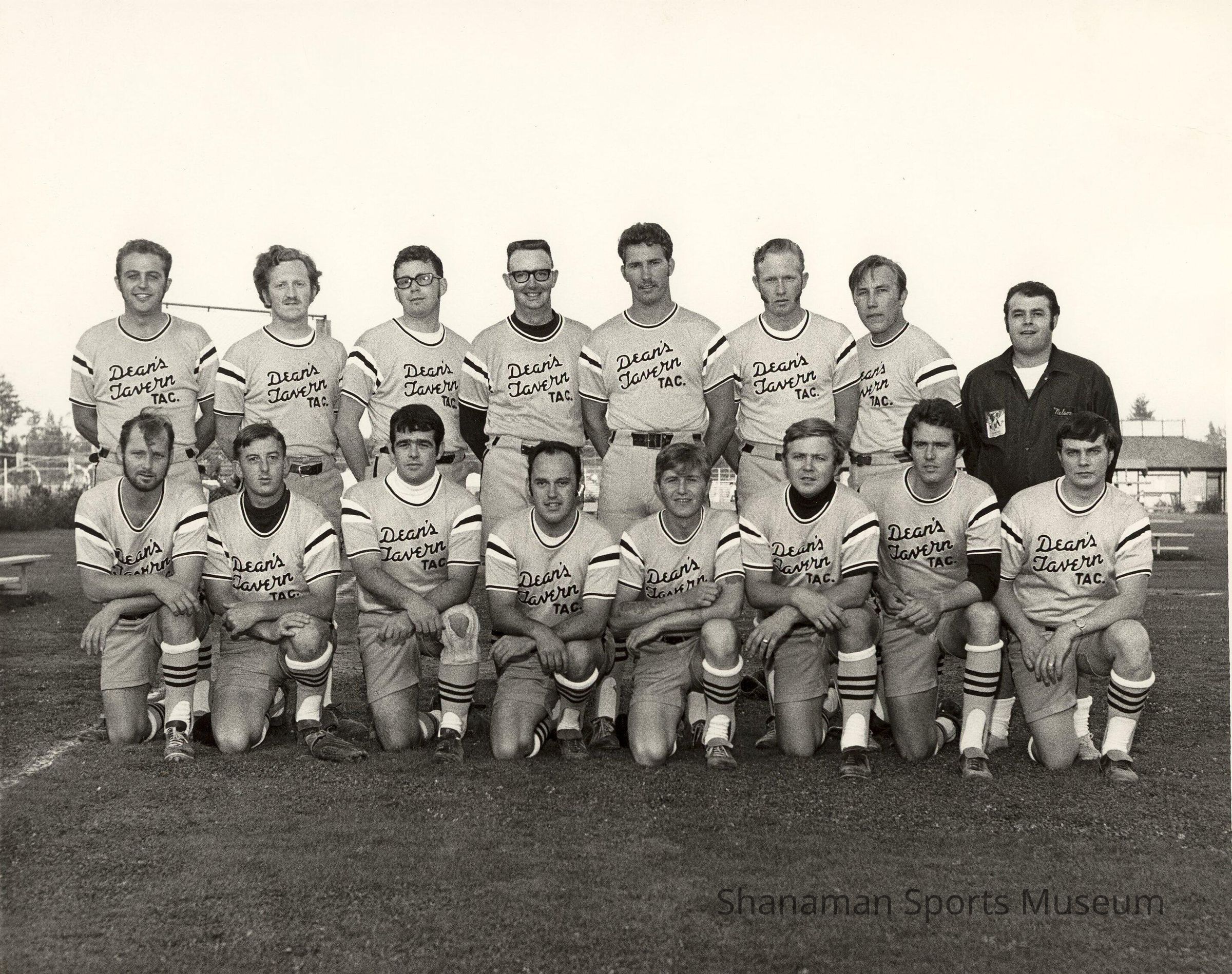 Sixteen members of the Dean's Tavern of Tacoma slowpitch softball team pose for a team photograph.