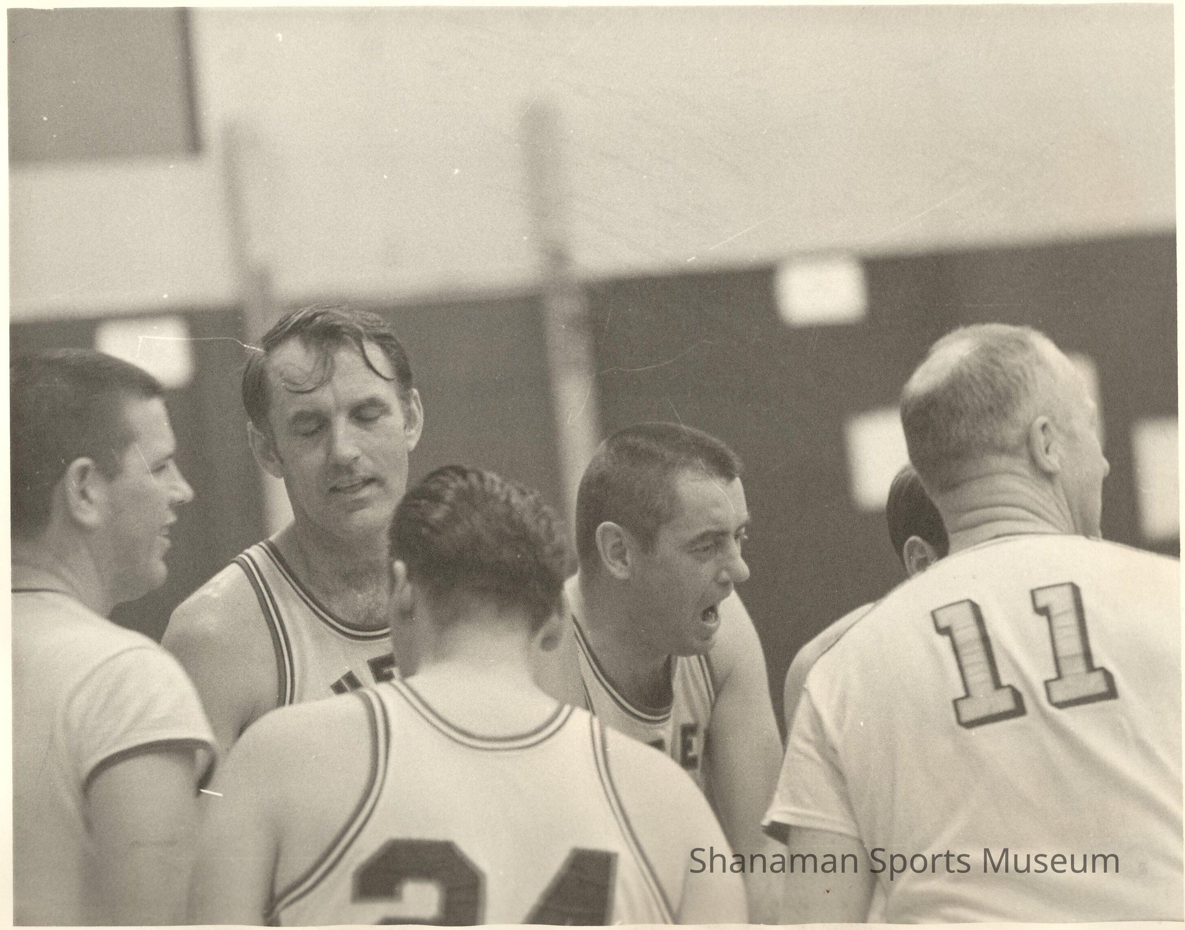 Photo, b/w, candid game shot of 6 players heads and shoulders. Appears to be Cheney Studs basketball team, Jack Johnson, Gene Lundgaard, Bob Ross with the backs of Tom Cross #11(far right foreground) and Al Maul #24 (center front foreground).