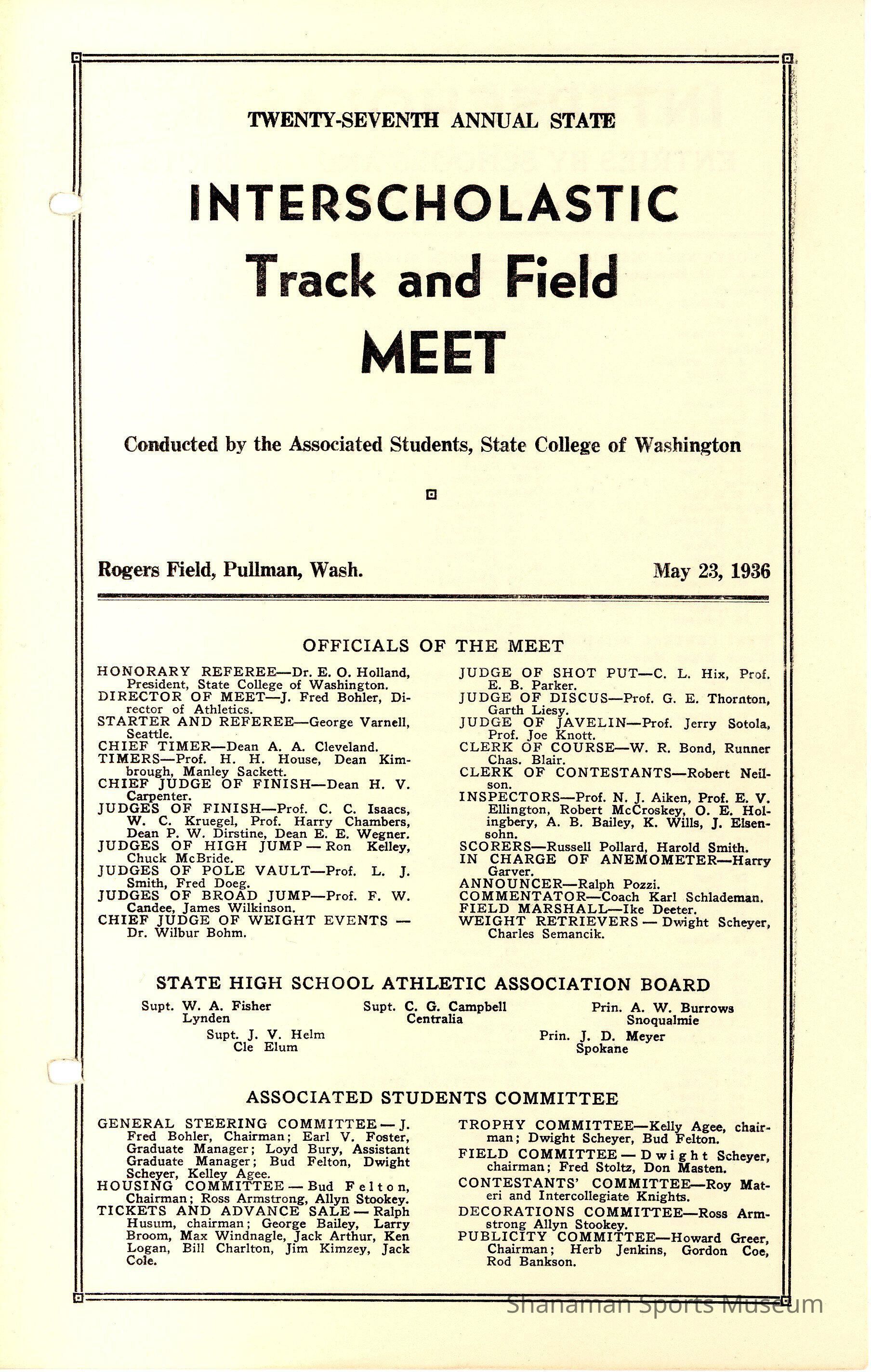 Program, 27th Annual State Interscholastic Track and Field Meet, WSC Pullman May 23, 1936Lexicon