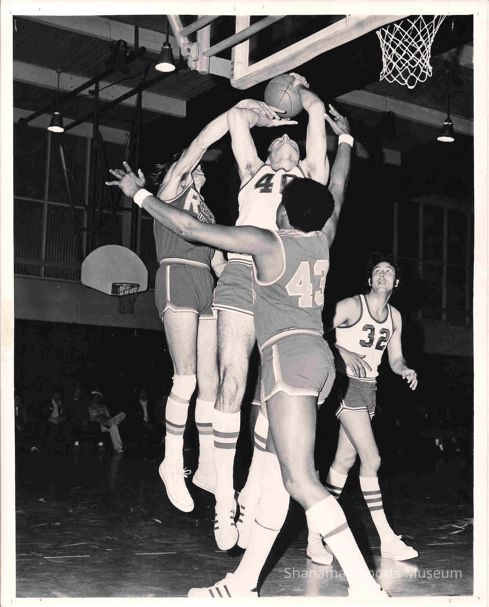 Plywood Tacoma’s Ted Werner goes up strong and is mobbed in an AAU game in Pacific Lutheran University’s Olson Auditorium in this undated photo. Werner had just finished a sterling career at Washington State University where he averaged a double-double over his three-year career, back when freshmen could not start. At 6-8 in the era of Lew Alcindor, he was an undersized big man as the Pac-8 launched, averaging 11.9 points and 10.9 rebounds per game. Also in the shot and playing in jersey #32 for Plywood Tacoma is former Pacific Lutheran University standout Jim Van Beek, who played as a high-achieving amateur for many years with both Plywood Tacoma and, previously, the Cheney Studs.Lexicon