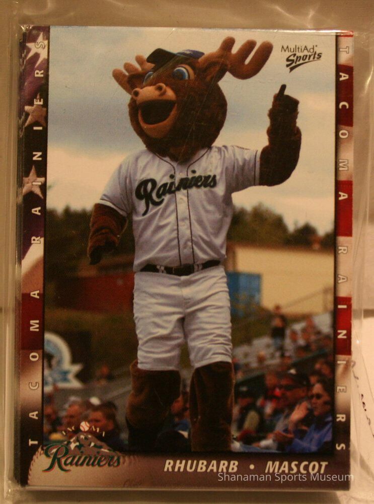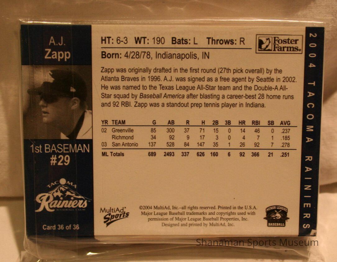 Baseball Cards, set of 36. 2004 Tacoma Rainiers. Set is in plastic packaging. Top card is mascot, Rhubarb. Last card is AJ Zapp.Lexicon