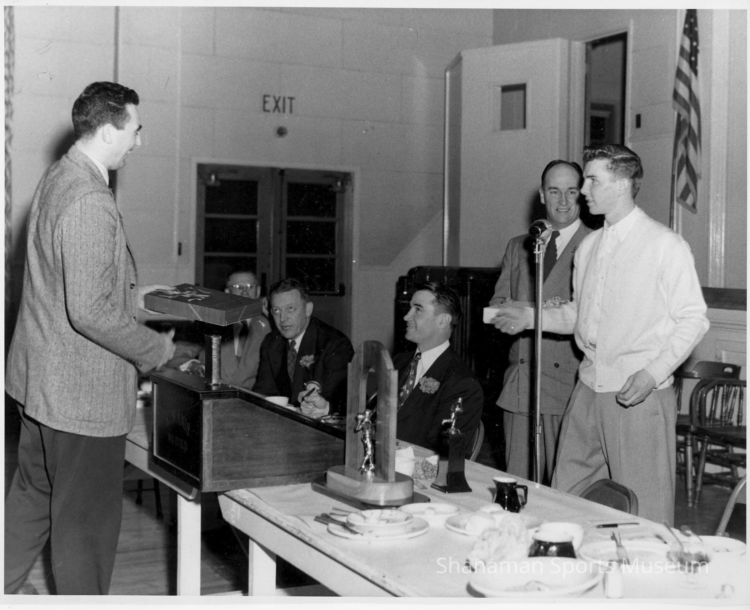 At the 1951 Lincoln High School football banquet, Norm Mayer, who coached Lincoln High School's football team for 23 years starting in 1943, stands on the right wearing a suit and tie. Mayer is one of 12 high school football coaches in Pierce County to win over 100 games. With a 140-50-6 record, he's the third winningest football coach all-time in the county.Lexicon