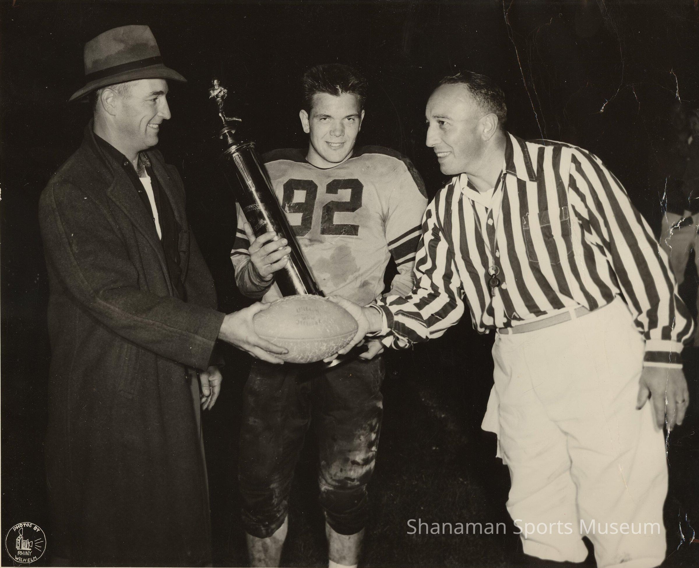 Norm Mayer (left) receives a football and trophy from referee Frank Gillihan in a post-game celebration after winning the annual Grid-Go-Round trophy in 1949. Joe Doyle, wearing jersey No. 92, smiles as he holds a large Grid-Go-Round trophy. Mayer, who grew up in California and played football at both the University of Washington and then the College of Puget Sound, coached football at Lincoln for 23 years. He's one of just 12 football coaches in Pierce County to win at least 100 games. He finished with a 140-50-6 record at Lincoln, the third most wins by a football coach in the county.