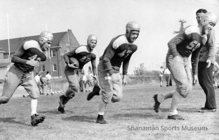 Football practice takes place at the College of Puget Sound in 1944. From left to right there is Jim O'Brien, Larry Rask (who is carrying the football), Cliff Schiesz and Al Fairhurst. The coach is Father Gordon Toner. Besides playing football, Rask and Schiesz also both played baseball for CPS and in high school for Bellarmine Prep. While at Bellarmine, Rask played football, basketball and baseball and earned 10 varsity letters. Schiesz played semi-pro baseball for the Grays Harbor Merchants. In 1947, he played spring training with the Tacoma Tigers before getting cut.