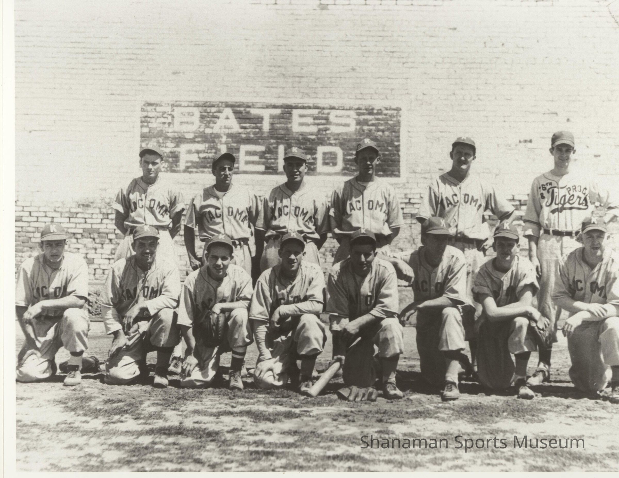 Fourteen players (13 wearing Tacoma jerseys, one wearing a Tigers jersey) of the K Street baseball team pose for a photo at Bates Field at the Walla Walla State Penitentiary.Made/Created