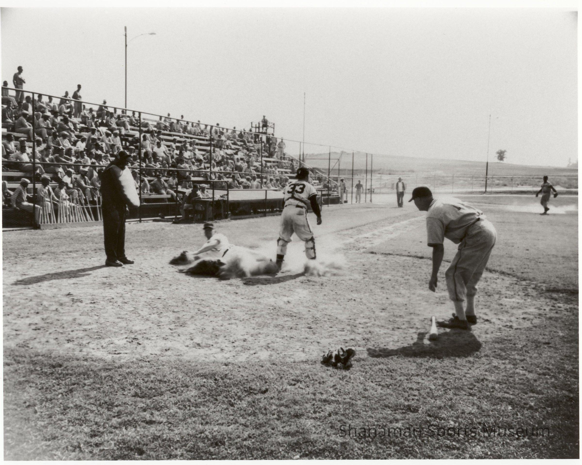 A player safely slides home as the catcher (No. 33) awaits a throw under the watchful eye of the home plate umpire in an undated photo at an unknown field in front of a bleacher full of fans on the third base side.