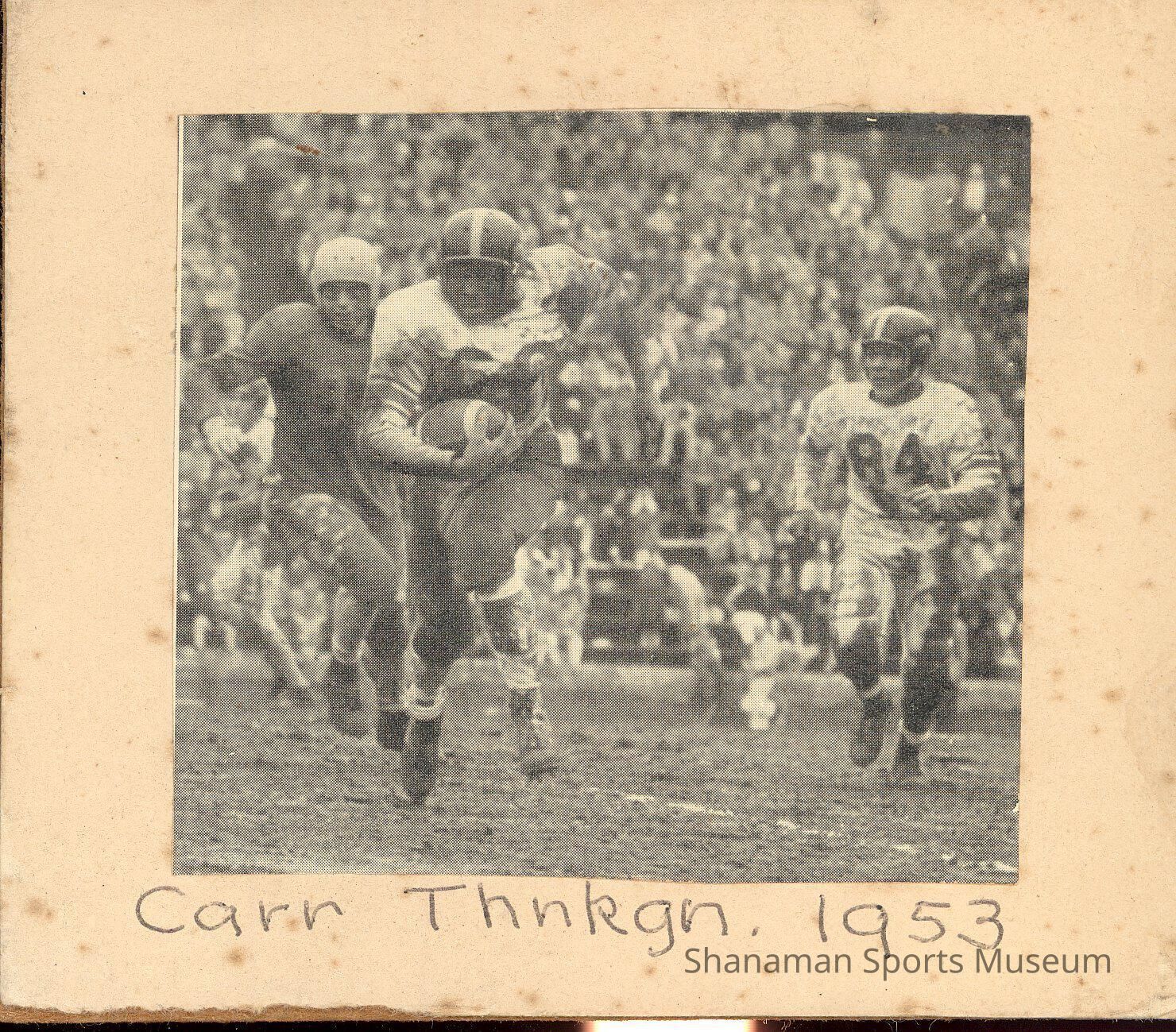 In this black-and-white photo taken in the fall of 1953 in a packed Lincoln Bowl, Luther Carr runs for daylight as he plays running back in a game for Lincoln High School. Carr was a rare four-sport star. In addition to earning all-state and all-city honors in football, Carr was a starter in basketball for the Abes, he was all-league in baseball and he was a state record holder in the long jump. At the University of Washington, Carr earned all-conference honors in football. He scored on a 76-yard touchdown romp on his first carry in a game against a California Bears team that would go on to play in the Rose Bowl.Lexicon