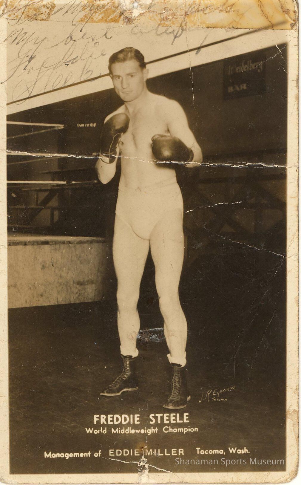 Freddie Steele, who was nicknamed “The Tacoma Assassin,” was the world middleweight champion from 1936 to 1938. Printed on the photo is “Freddie Steele, world middleweight champion, management of Eddie Miller, Tacoma, Wash.” In the 1940s, Steele went to Hollywood and was in numerous movies. He was inducted into both the International Boxing Hall of Fame and the World Boxing Hall of Fame. In 1936, Steele defeated Babe Risko with a unanimous 15-round decision in Seattle to win the world middleweight title. Steele lost only two of his fights in his first 10 years boxing and finished with 125 wins, five losses and 11 draws.Lexicon