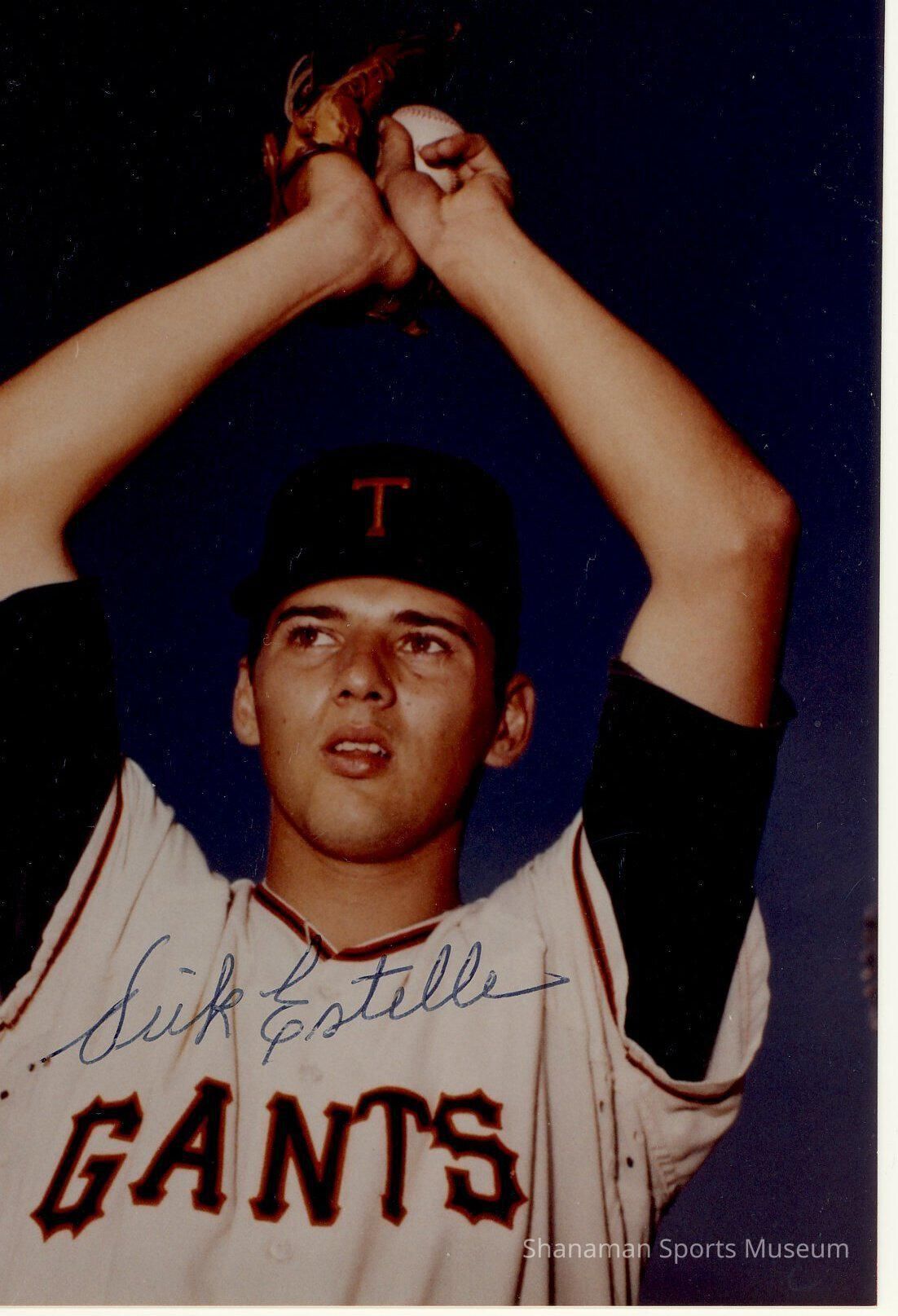With his hands raised above his head, Dick Estelle goes into his windup as he pitches for the Tacoma Giants. Estelle pitched for the Tacoma Giants in the 1960s and then moved up to the San Francisco Giants in 1964 and 1965. Estelle was inducted into Lakewood High School's Hall of Fame in 2006. Signed in black ink "Dick Estelle."Lexicon