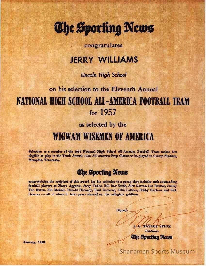 color photocopy, letter from Sporting News to Jerry Williams selecting him as 1957 high school All American Football teamRelationships