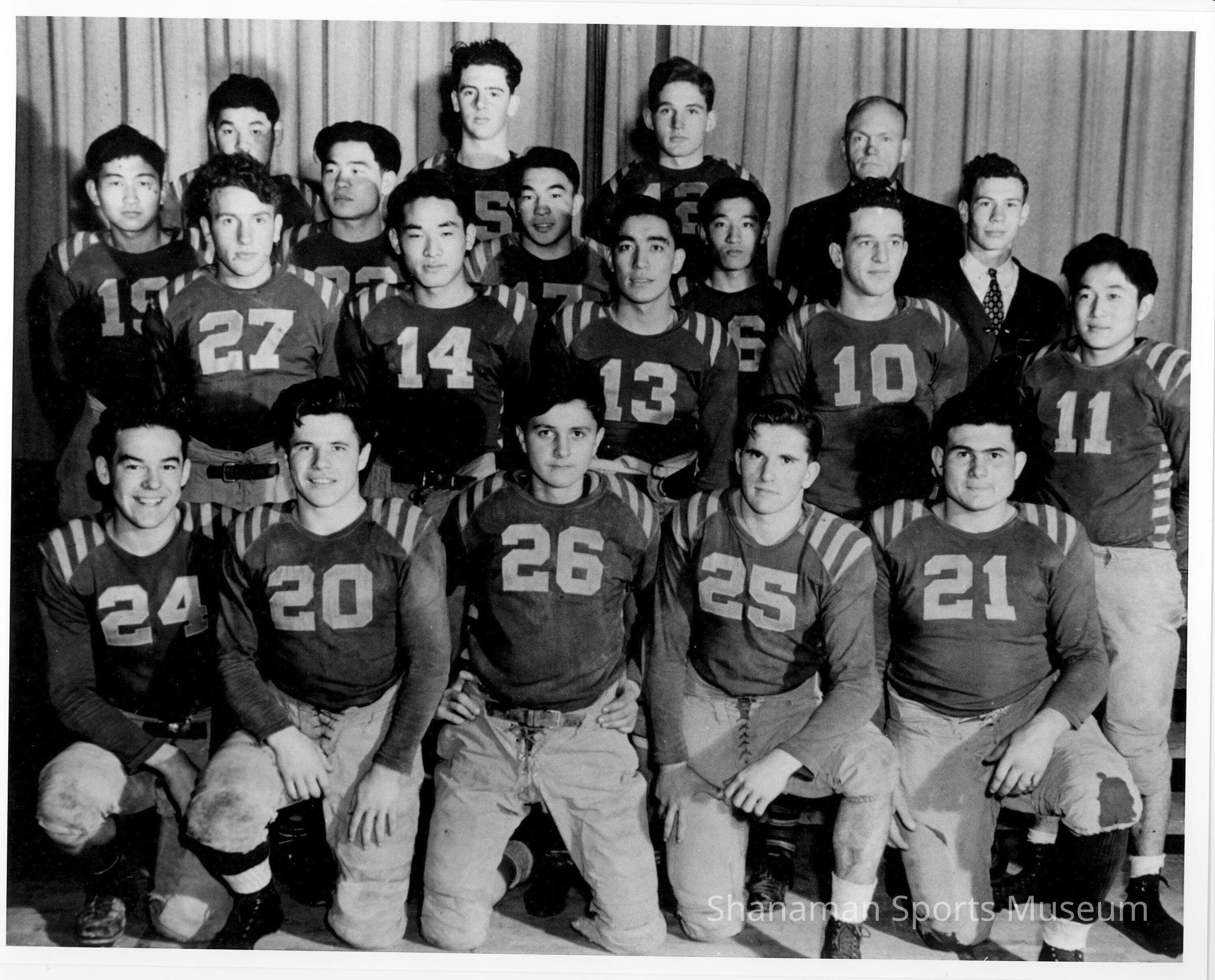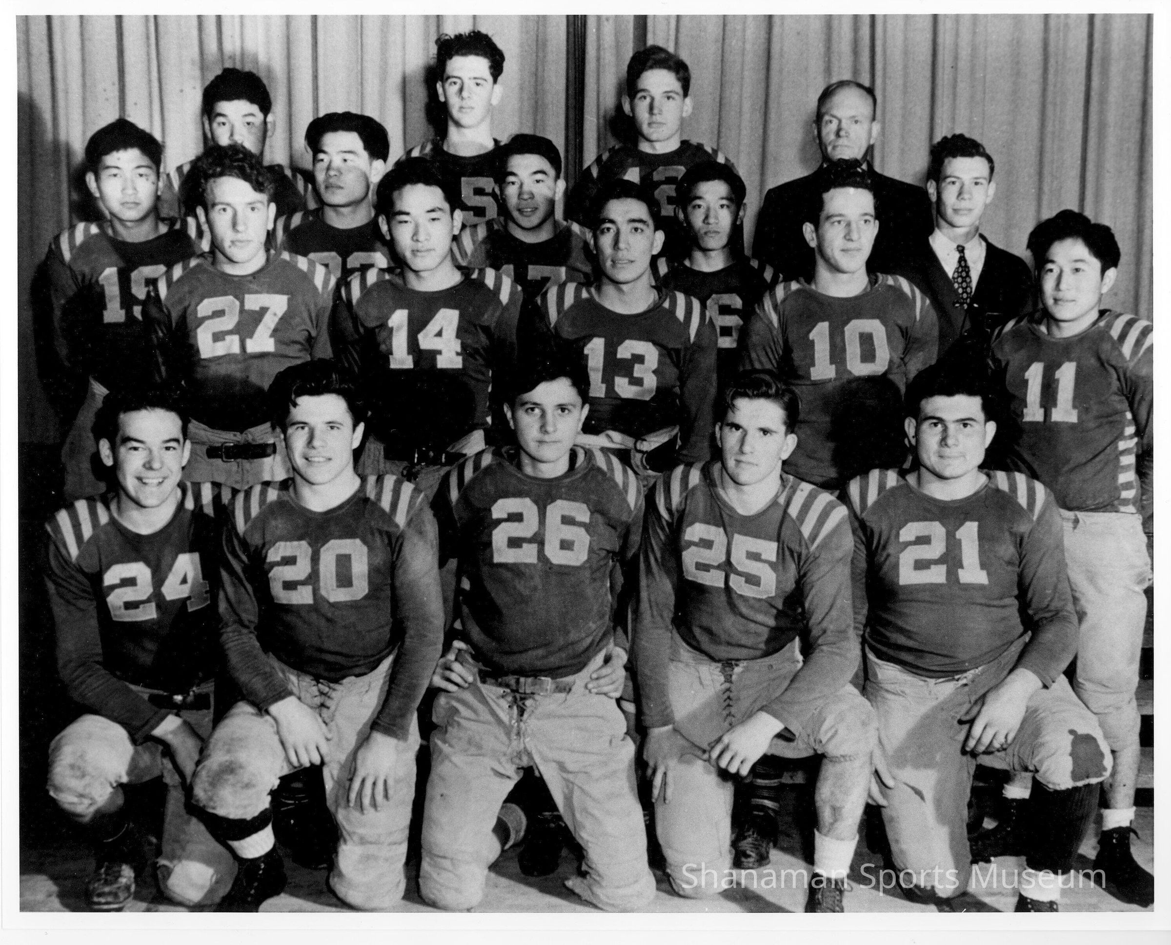 Seventeen players, a student manager (second row from top, right) and coach Bill Vinson (back row, right) of the 1939 Class B state football champion Fife Trojans.Lexicon