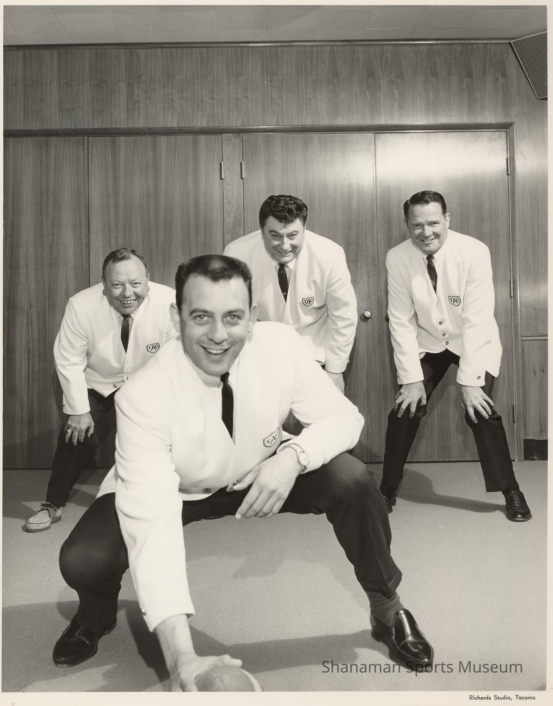 Stan Naccarato, front, and Ben Cheney, left, pose with two others as the four wear white blazers with Tacoma Athletic Commission patches.