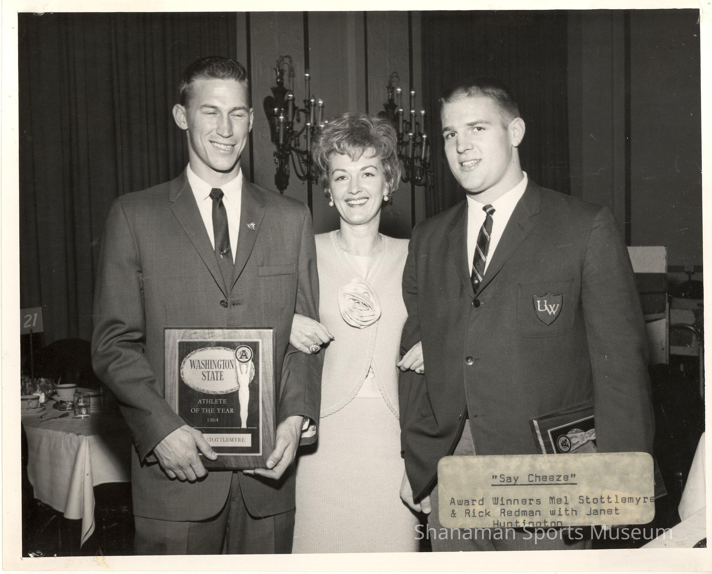 In 1964, in the early stages of their legendary sports careers, Mel Stottlemyre and Rick Redman received Washington State Athlete of the Year honors at a ceremony in Tacoma. The men pose for a picture with Janet Huntington. A year later, Stottlemyre made the first of five All-Star Games while playing for the New York Yankees. The Yankees immortalized him with a plaque in Monument Park. Redman was a two-time All-American linebacker for the Washington Huskies before going on to play nine seasons for the San Diego Chargers. He was inducted into the College Football Hall of Fame in 1995.Lexicon