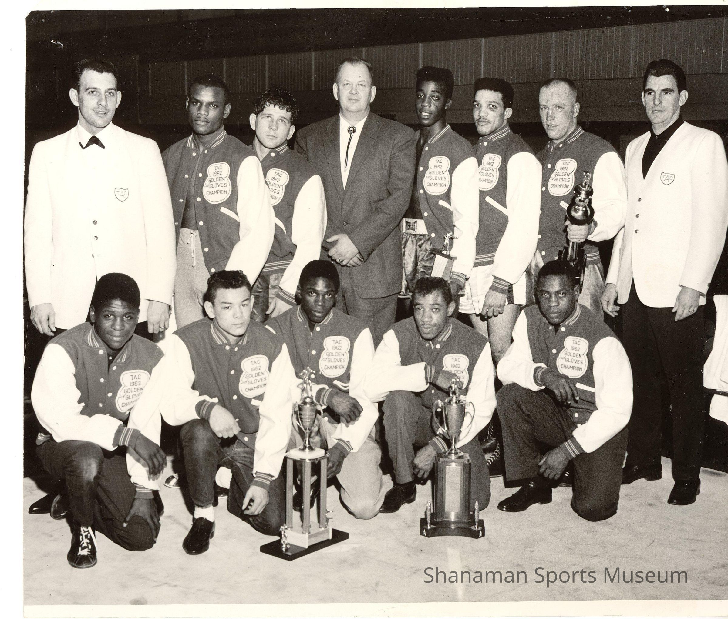 1962 Tacoma Golden Gloves event where 10 of the 13 men are wearing “TAC Golden Gloves 1962 Champion” jackets. The first Tacoma Golden Gloves events was held in 1949 and was hosted by the Tacoma Athletic Commission. In the picture, Stan Naccarato is in back row left, and Bill Gazecki is back row right and they flank the winners in the tournament. Naccarato, a former minor league baseball player, was key in keeping the Triple A Rainiers in Tacoma and in getting the Tacoma Dome built.Lexicon