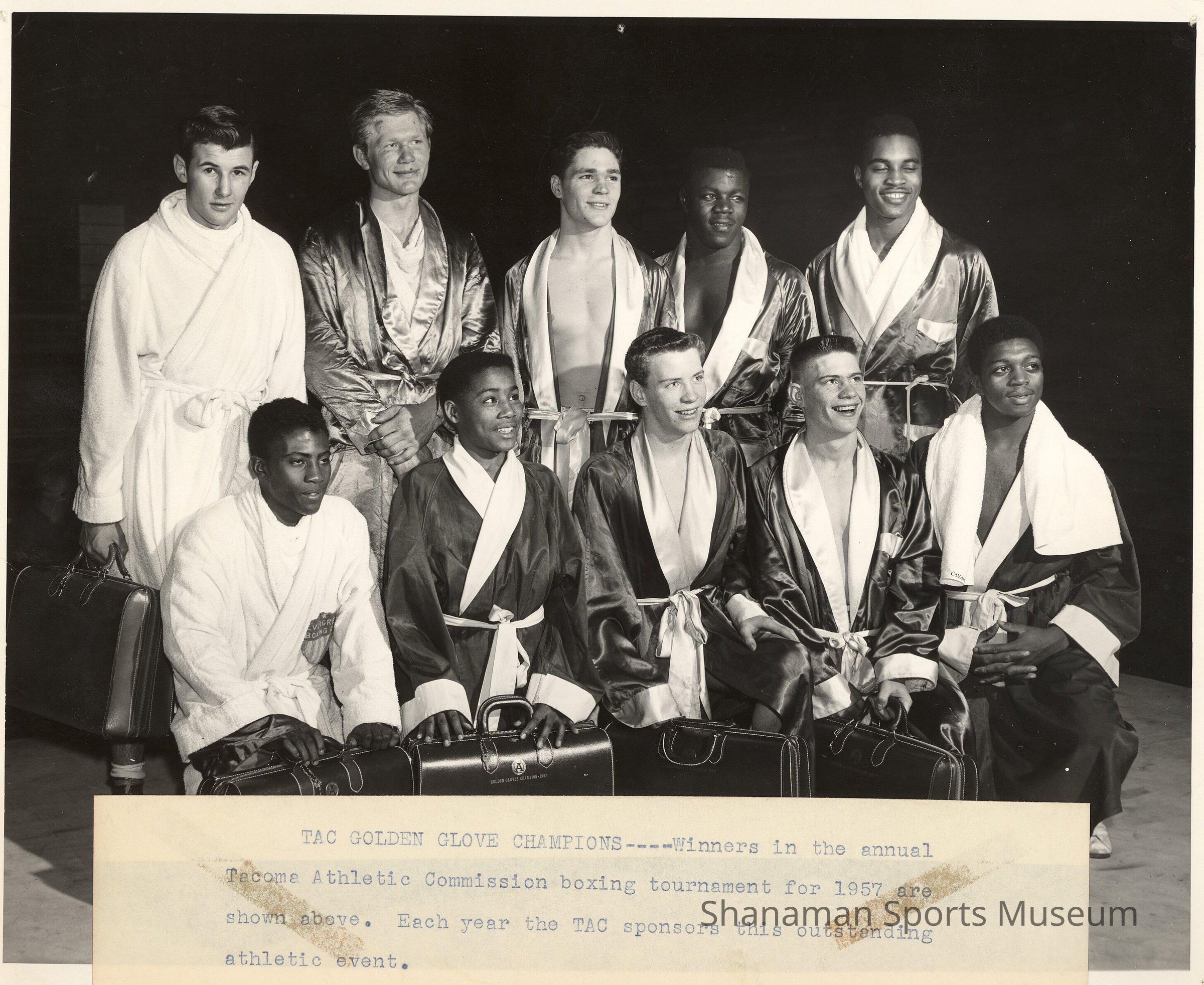 Photo, b/w, 10 boxers wearing robes. 5 hold briefcases with TAC logo and "Golden Gloves Champion 1957" on side. Label pasted to front: "TAC GOLDEN GLOVES CHAMPIONS ---- Winners in the annual Tacoma Athletic Commission boxing tournament for 1957 are shownLexicon