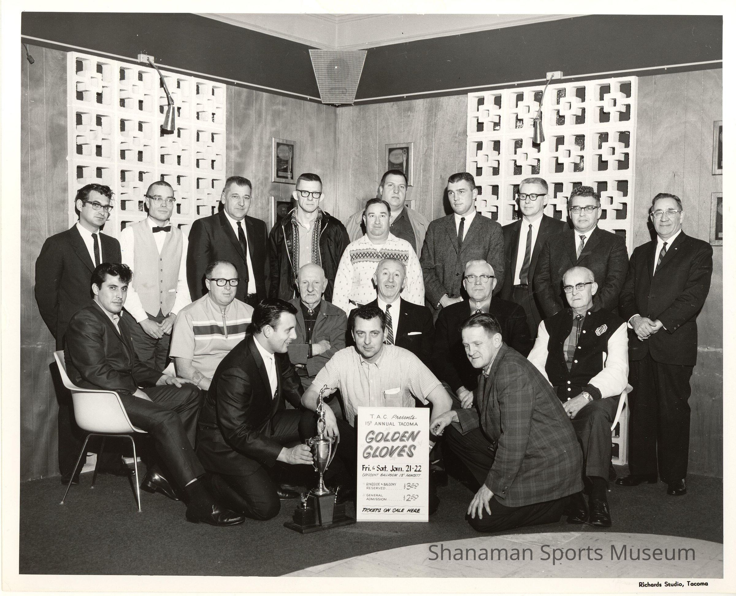 Photo, b/w, 19 men in suits and street clothes posed around trophy and sign: "T.A.C. Presents 15th Annual Golden Gloves, Fri. & Sat. Jan. 21-22 Crescent Ballroom 13th Fawcett, Ringside & Balcony Reserved $3.50, General Admission $2.50, Tickets on Sale Here.Lexicon