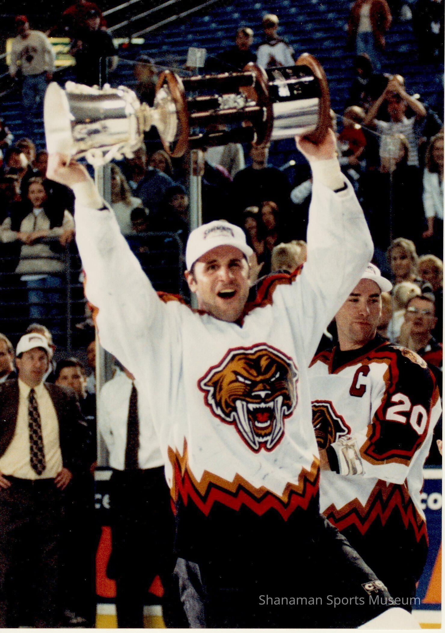 An unidentified Tacoma Sabercat player raises the Taylor Cup overhead as the team celebrates winning the West Coast Hockey League Championship during the 1998-99 season. Pictured to the right is teammate Scott Boston. The Sabercats were a professional minor league hockey team that began playing in the 1997-88 West Coast Hockey League season and had a successful five-year run. Tacoma won the regular-season Northern Division title and reached the league finals in its first season. The Sabercats lost to the defending champion San Diego Gulls in the league’s first Taylor Cup. The following season, the Sabercats returned to the playoffs after winning the Northern Division title again and this time defeated the Gulls in the Cup finals. It would be the only league championship for the franchise, which folded after the 2001-02 season. The Sabercats made the playoffs all five seasons, winning three division championships as well.Made/Created